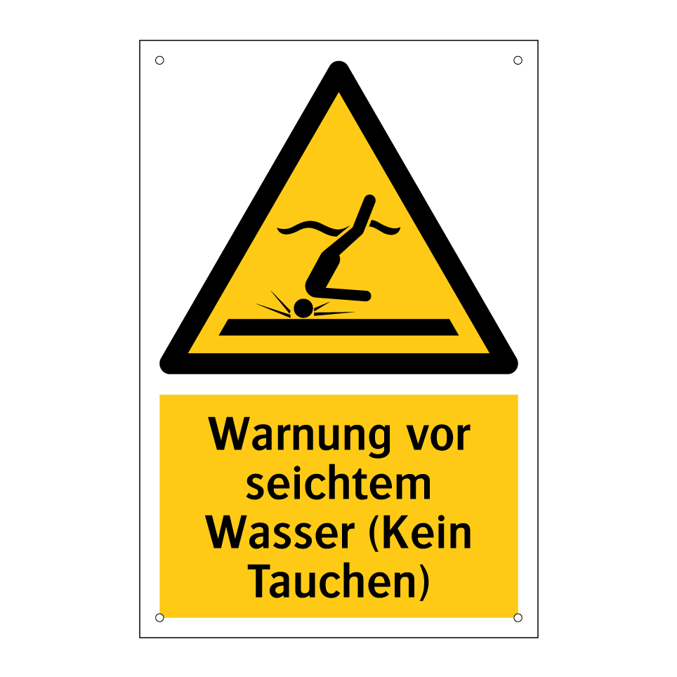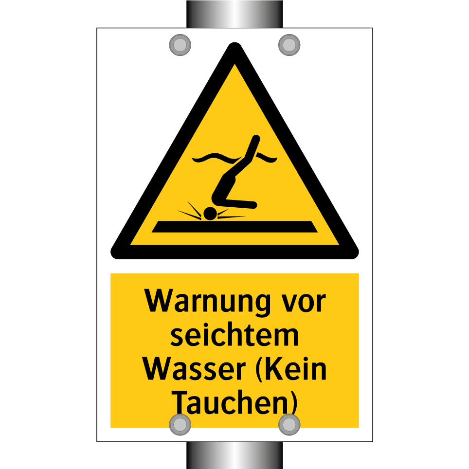 Warnschild mit dem Text Warnung vor seichtem Wasser (Kein Tauchen)
