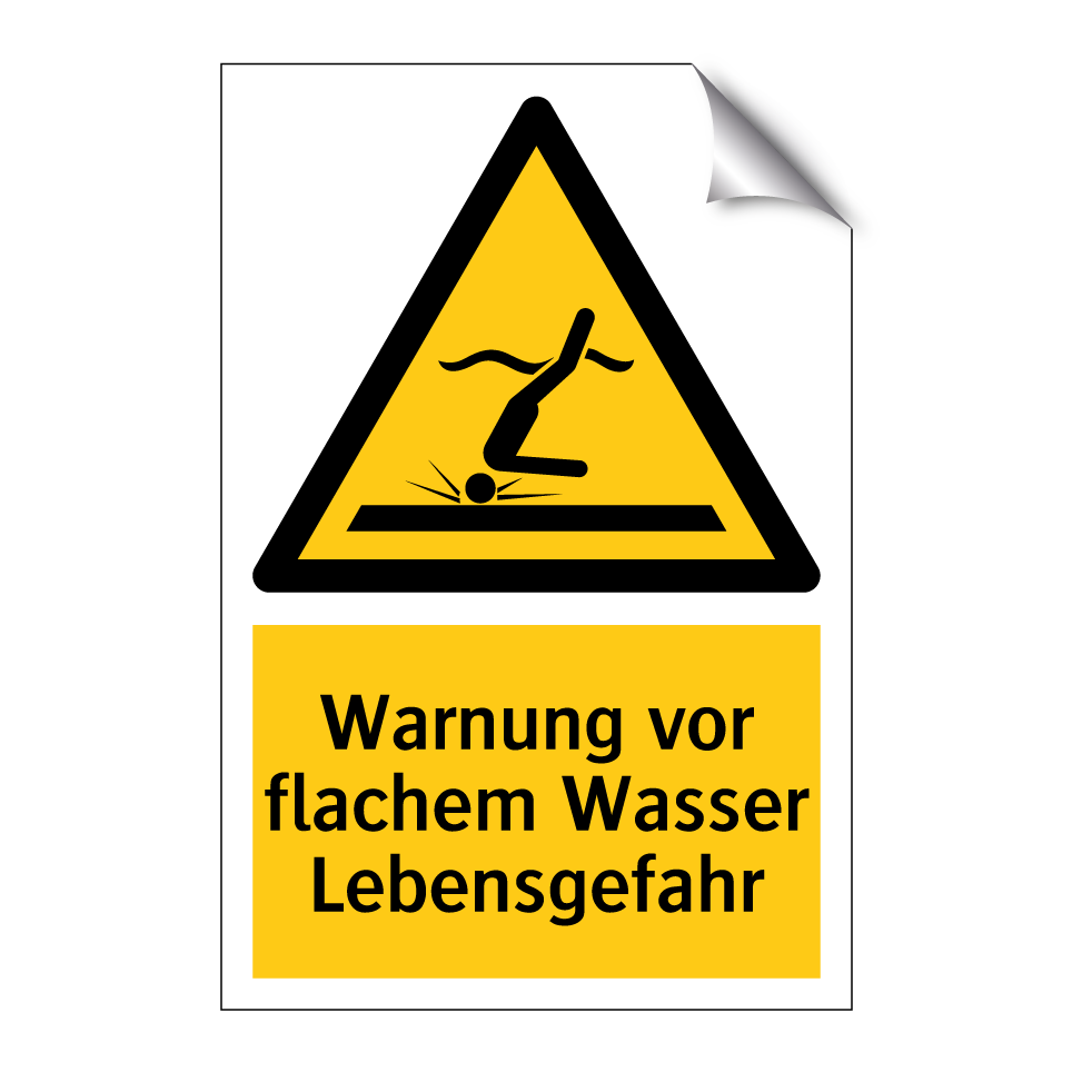 Warnschild mit dem Text Warnung vor flachem Wasser Lebensgefahr