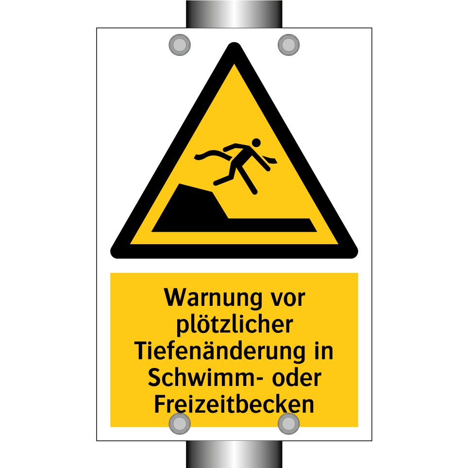 Warnschild mit dem Text Warnung vor plötzlicher Tiefenänderung in Schwimm- oder Freizeitbecken