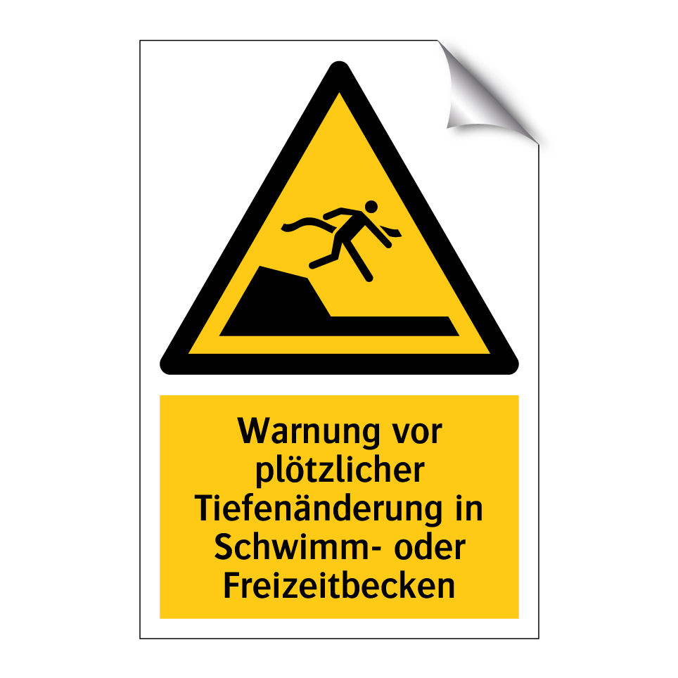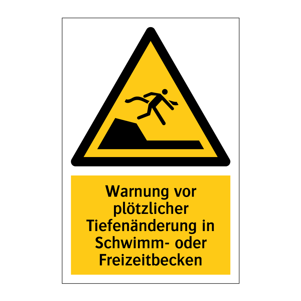Diese auffällige Warnschild mit gelbem Hintergrund und schwarzem Text ist ideal für Schwimm- und Freizeitbecken, um auf plötzliche Tiefenänderungen hinzuweisen. Die klare Symbolik sorgt dafür, dass die Botschaft sofort verstanden wird, was die Sicherheit der Badegäste erhöht. Platzieren Sie das Warnschild an gut sichtbaren Stellen, wie am Beckenrand oder in der Nähe von Einstiegsbereichen, um die Aufmerksamkeit der Schwimmer zu gewährleisten. Diese Warnschilder sind besonders nützlich in öffentlichen Schwimmbädern, Wasserparks oder Hotelpools, wo unterschiedliche Tiefen eine potenzielle Gefahr darstellen können. Sorgen Sie für ein sicheres Badeerlebnis, indem Sie auf mögliche Risiken hinweisen.