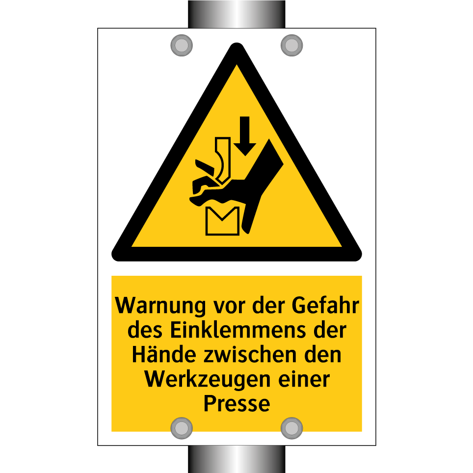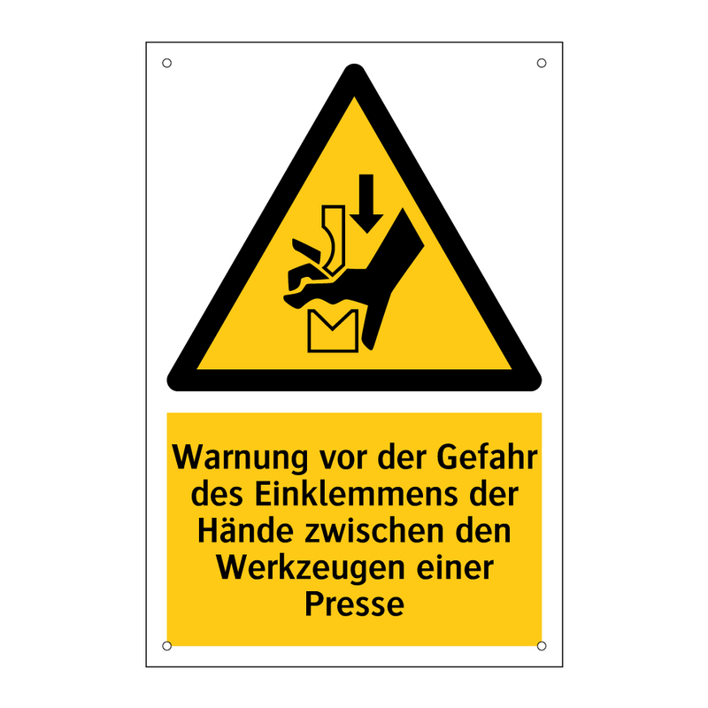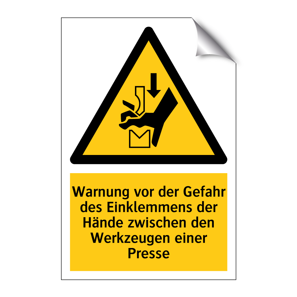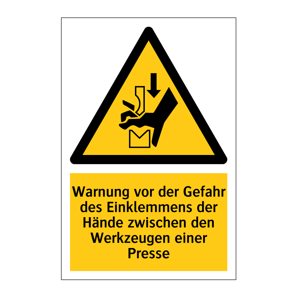 Warnschild mit dem Text Warnung vor der Gefahr des Einklemmens der Hände zwischen den Werkzeugen einer Presse