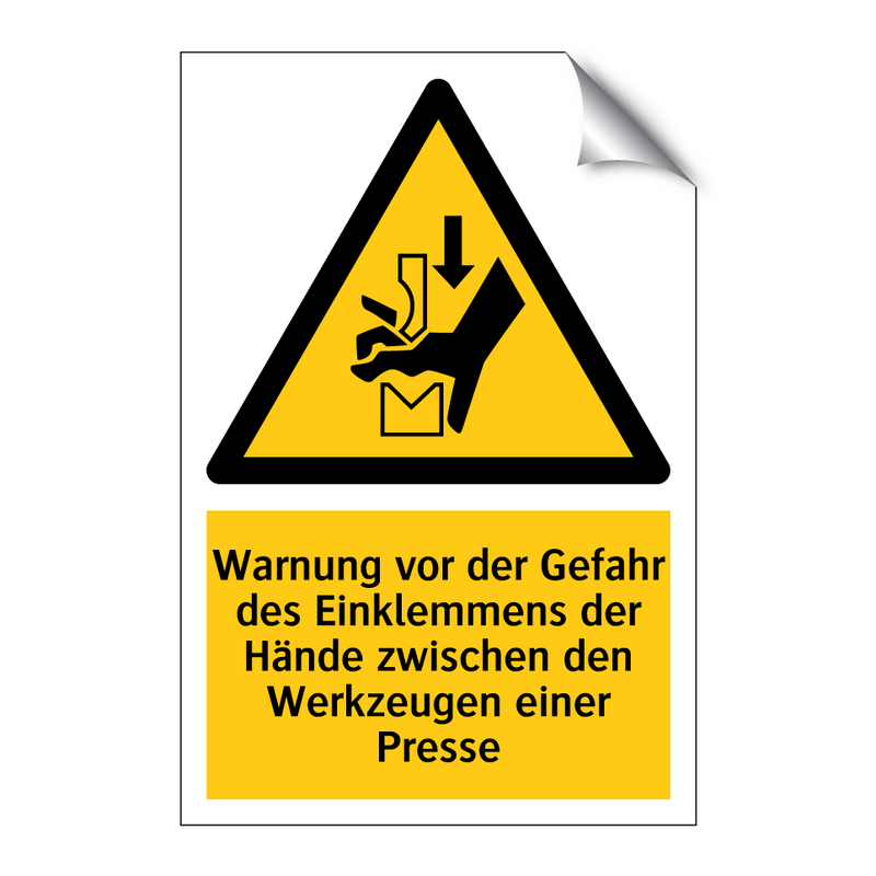 Diese auffällige Warnschild mit gelbem Hintergrund und schwarzem Text ist ideal für den Einsatz in industriellen Umgebungen, in denen Maschinen mit beweglichen Teilen betrieben werden. Sie dient dazu, Mitarbeiter und Besucher vor der Gefahr des Einklemmens der Hände zwischen den Werkzeugen einer Presse zu warnen. Platzieren Sie diese Warnschilder an gut sichtbaren Stellen in der Nähe von Maschinen, um das Risiko von Unfällen zu minimieren. Besonders geeignet ist sie für Fabriken, Werkstätten und Produktionshallen, wo Sicherheit oberste Priorität hat. Durch die klare Symbolik und die prägnante Botschaft wird die Aufmerksamkeit effektiv auf potenzielle Gefahren gelenkt.