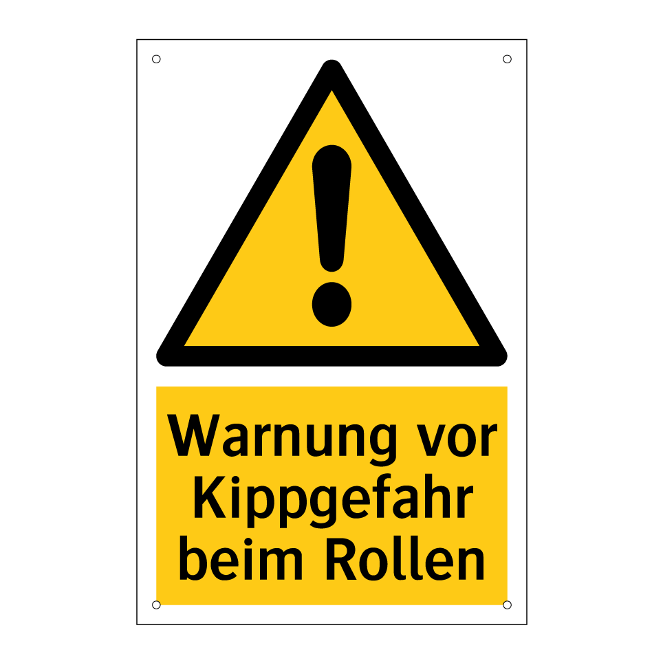 Warnschild mit dem Text Warnung vor Kippgefahr beim Rollen