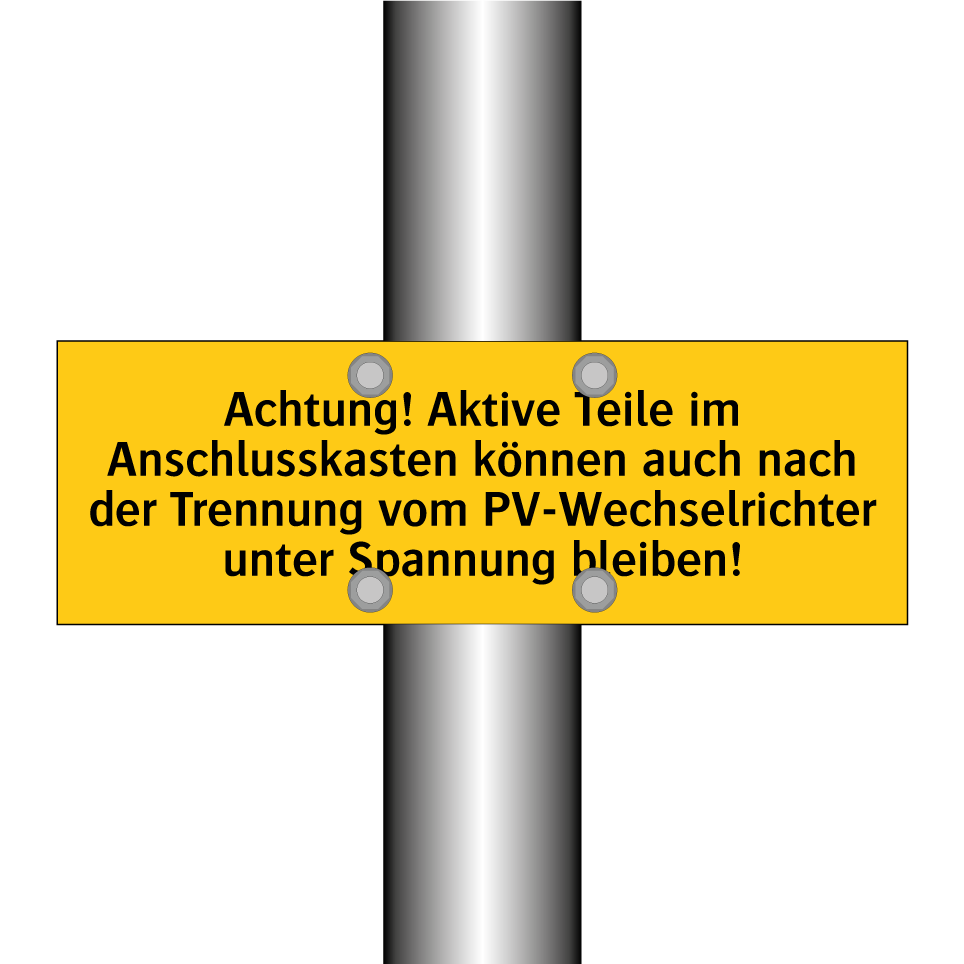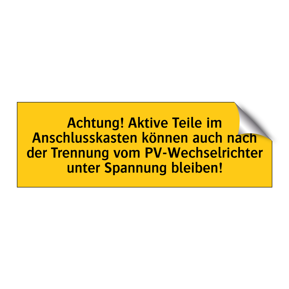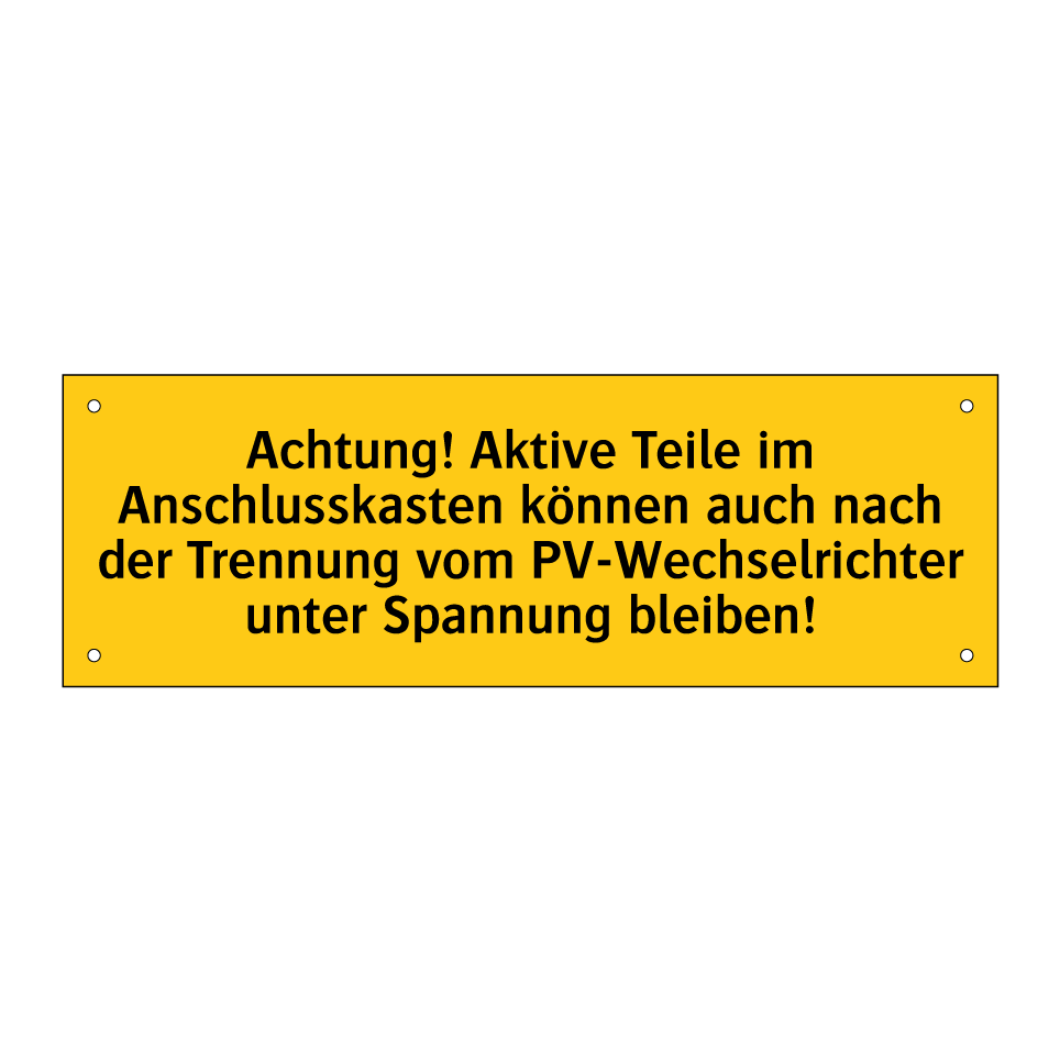 Warnschild mit dem Text Achtung! Aktive Teile im Anschlusskasten können auch nach der Trennung vom PV-Wechselrichter unter Spannung bleiben!