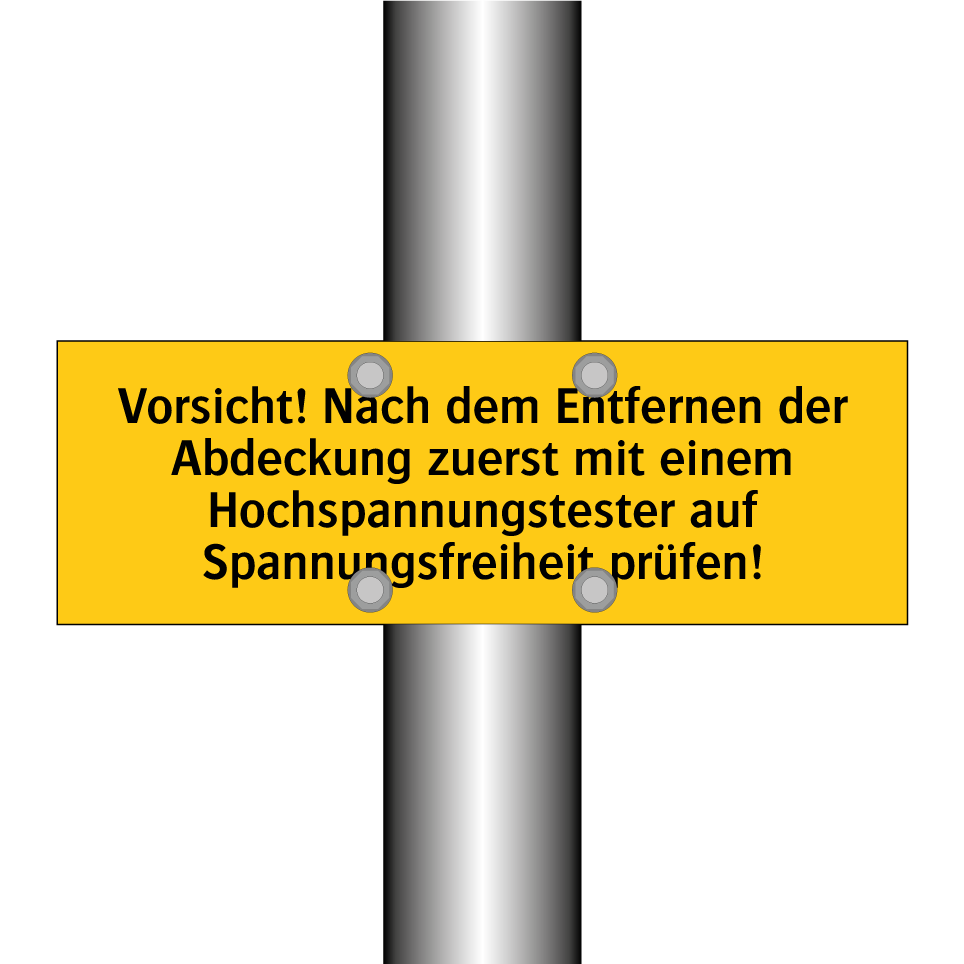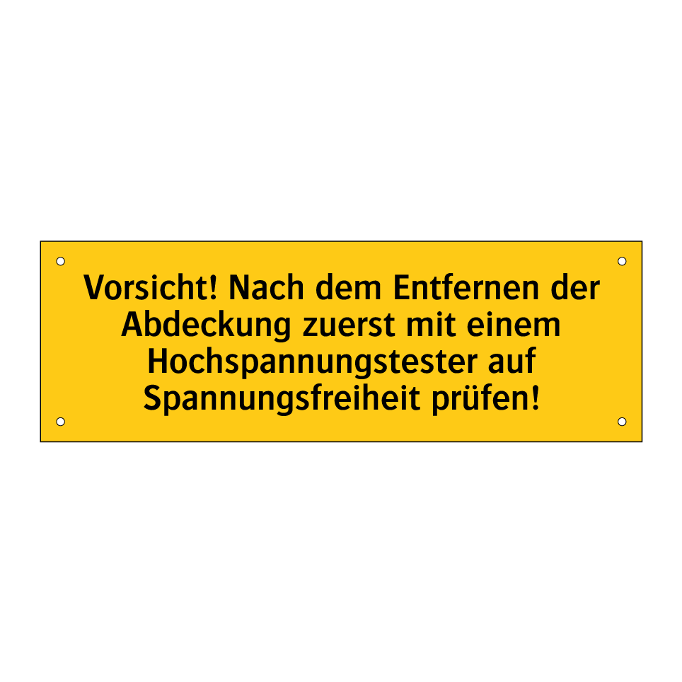 Warnschild mit dem Text Vorsicht! Nach dem Entfernen der Abdeckung zuerst mit einem Hochspannungstester auf Spannungsfreiheit prüfen!