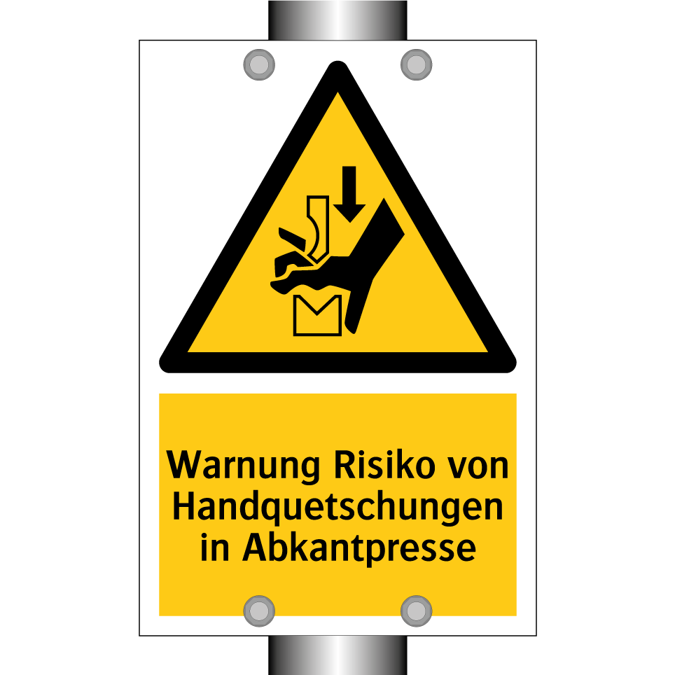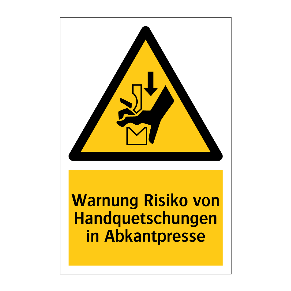 Warnschild mit dem Text Warnung Risiko von Handquetschungen in Abkantpresse