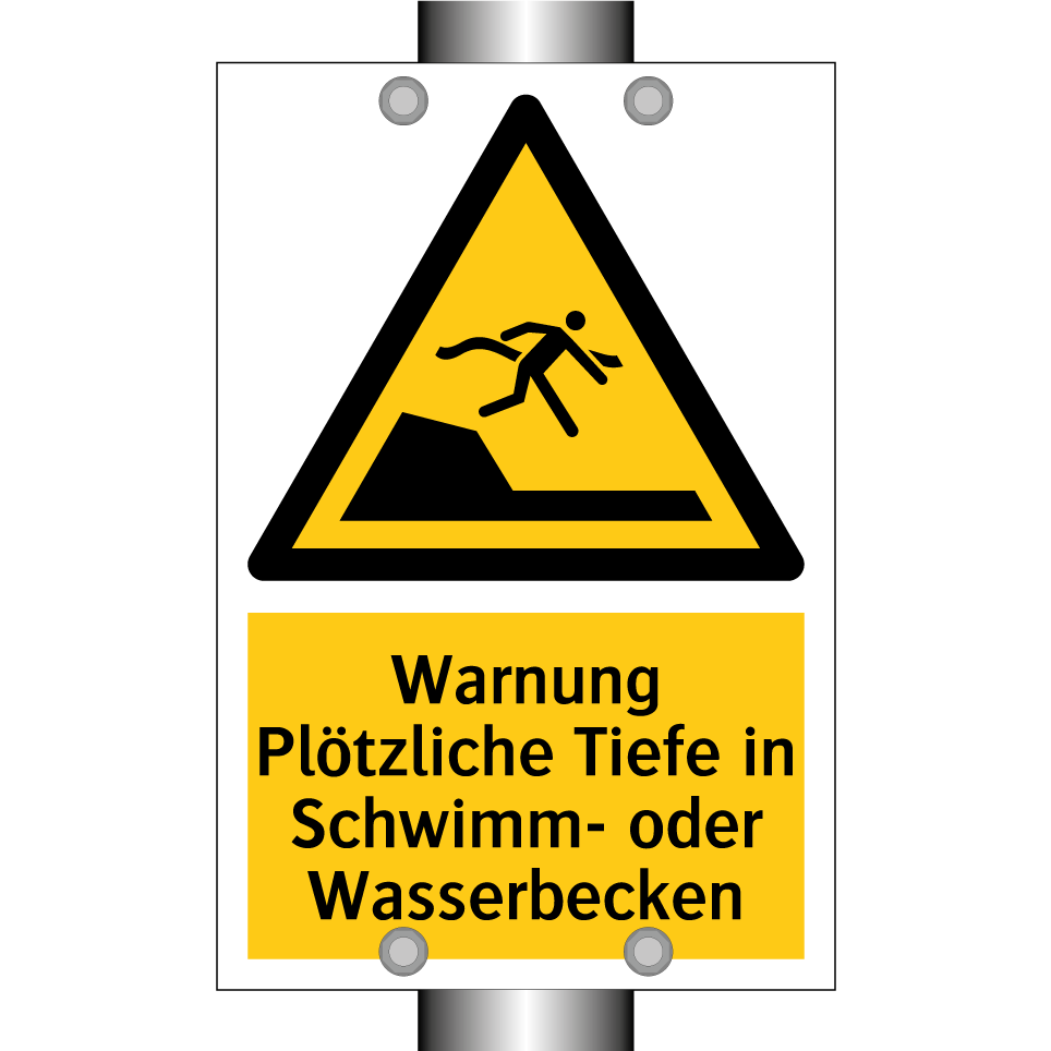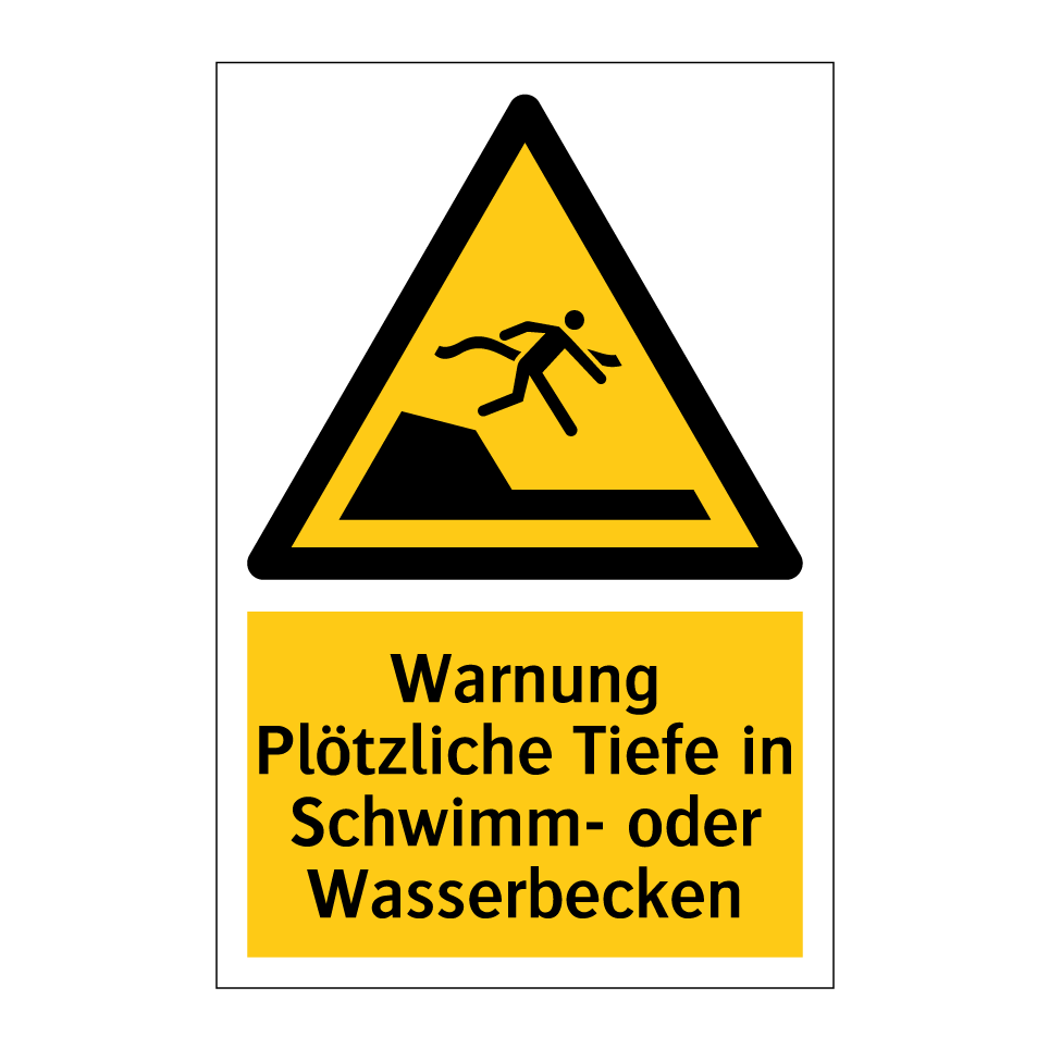 Diese auffällige Warnschild mit gelbem Hintergrund und schwarzem Text ist ideal für den Einsatz in Schwimmbädern oder Wasseranlagen. Sie dient dazu, Besucher auf plötzliche Tiefen aufmerksam zu machen und potenzielle Gefahren zu minimieren. Die klare Symbolik und die prägnante Botschaft sorgen dafür, dass die Warnung nicht übersehen wird. Platzieren Sie das Warnschild an gut sichtbaren Stellen, wie am Beckenrand oder in der Nähe von Einstiegsbereichen, um die Sicherheit der Badegäste zu gewährleisten. Diese Warnschilder sind unverzichtbar, um Unfälle zu vermeiden und die Aufmerksamkeit der Besucher zu schärfen.
