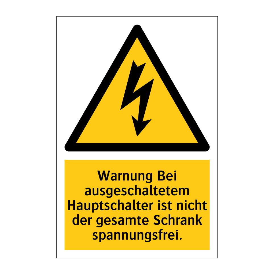 Warnschild mit dem Text Warnung Bei ausgeschaltetem Hauptschalter ist nicht der gesamte Schrank spannungsfrei.
