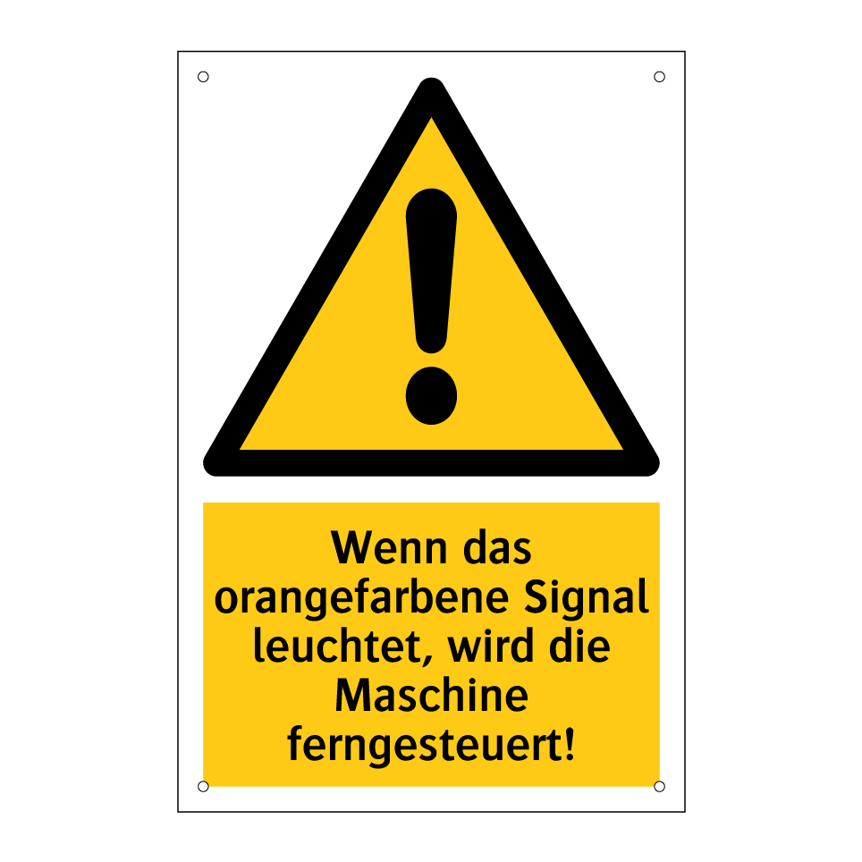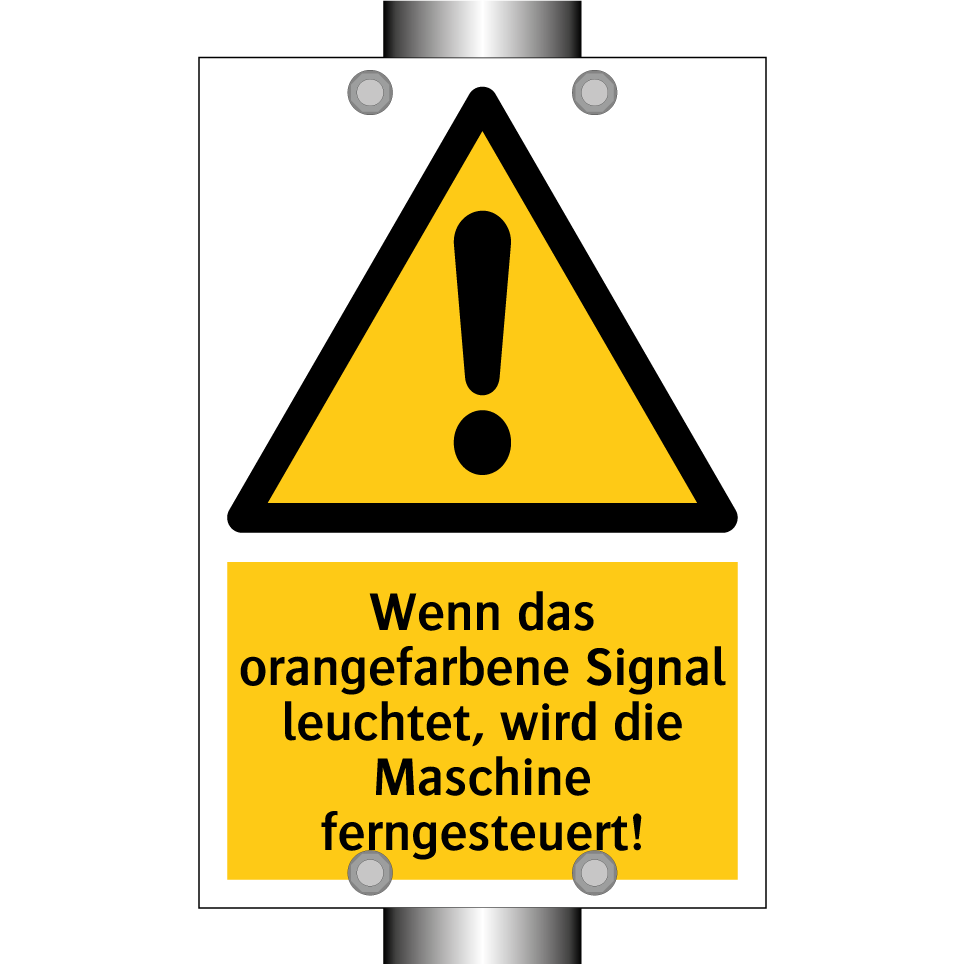 Warnschild mit dem Text Wenn das orangefarbene Signal leuchtet, wird die Maschine ferngesteuert!