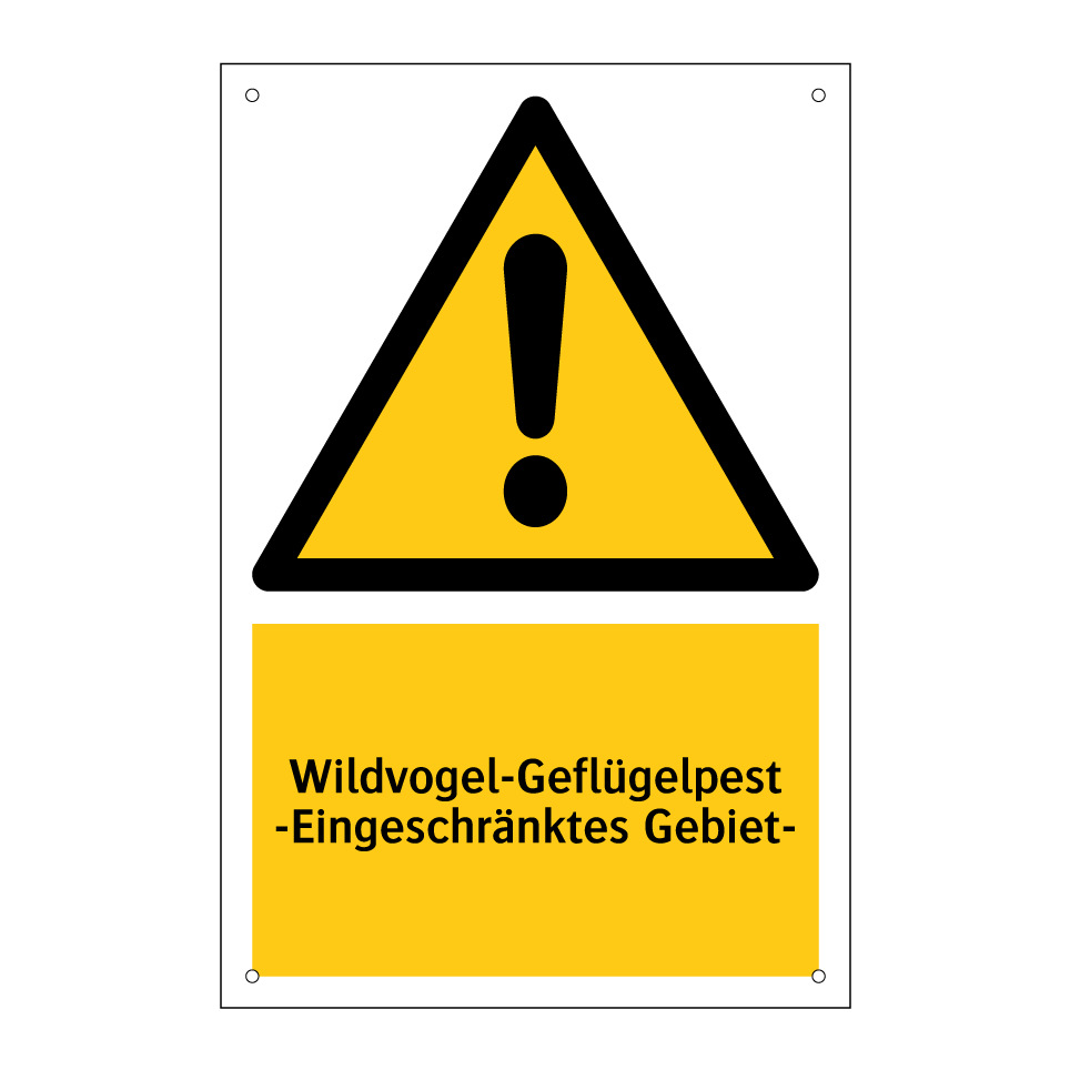 Warnschild mit dem Text Wildvogel-Geflügelpest -Eingeschränktes Gebiet-
