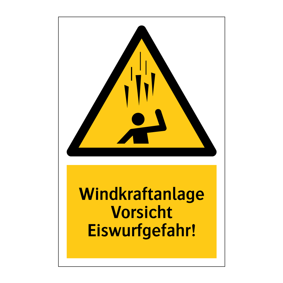 Warnschild mit dem Text Windkraftanlage Vorsicht Eiswurfgefahr!