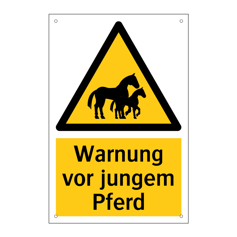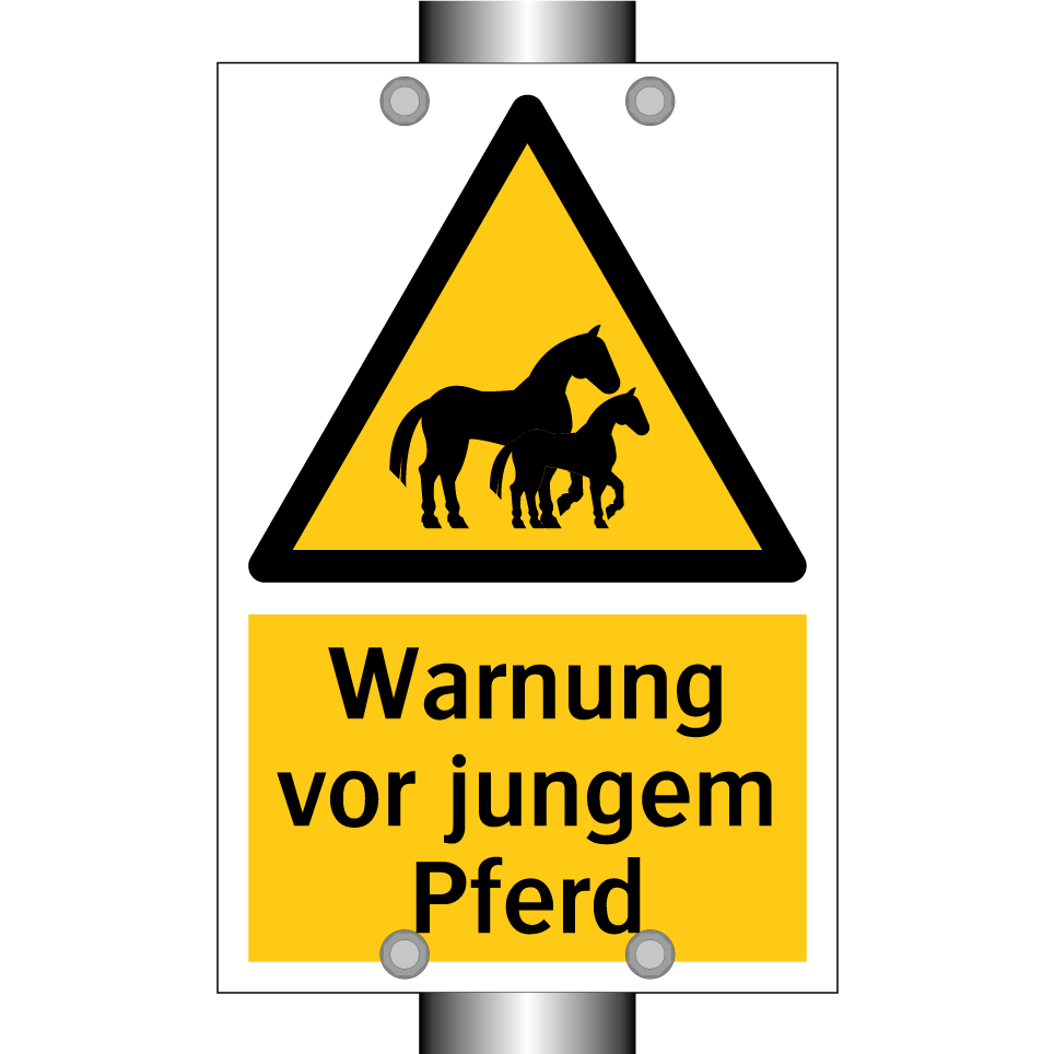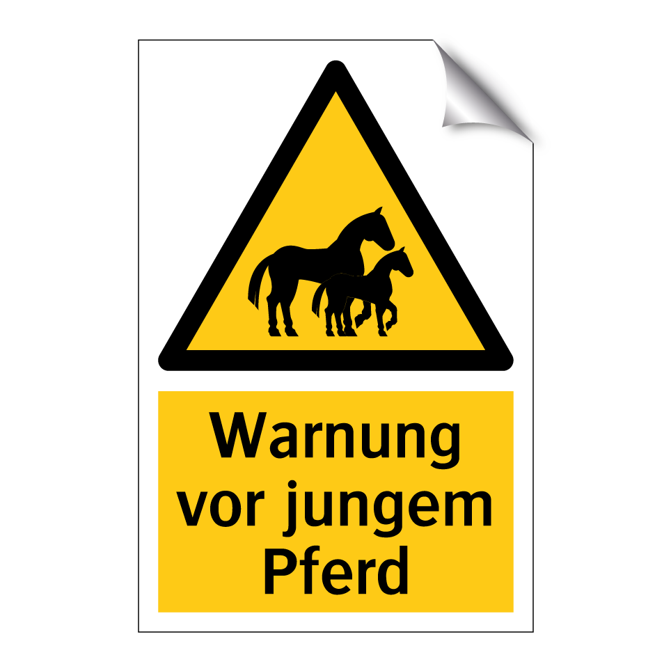 Warnschild mit dem Text Warnung vor jungem Pferd