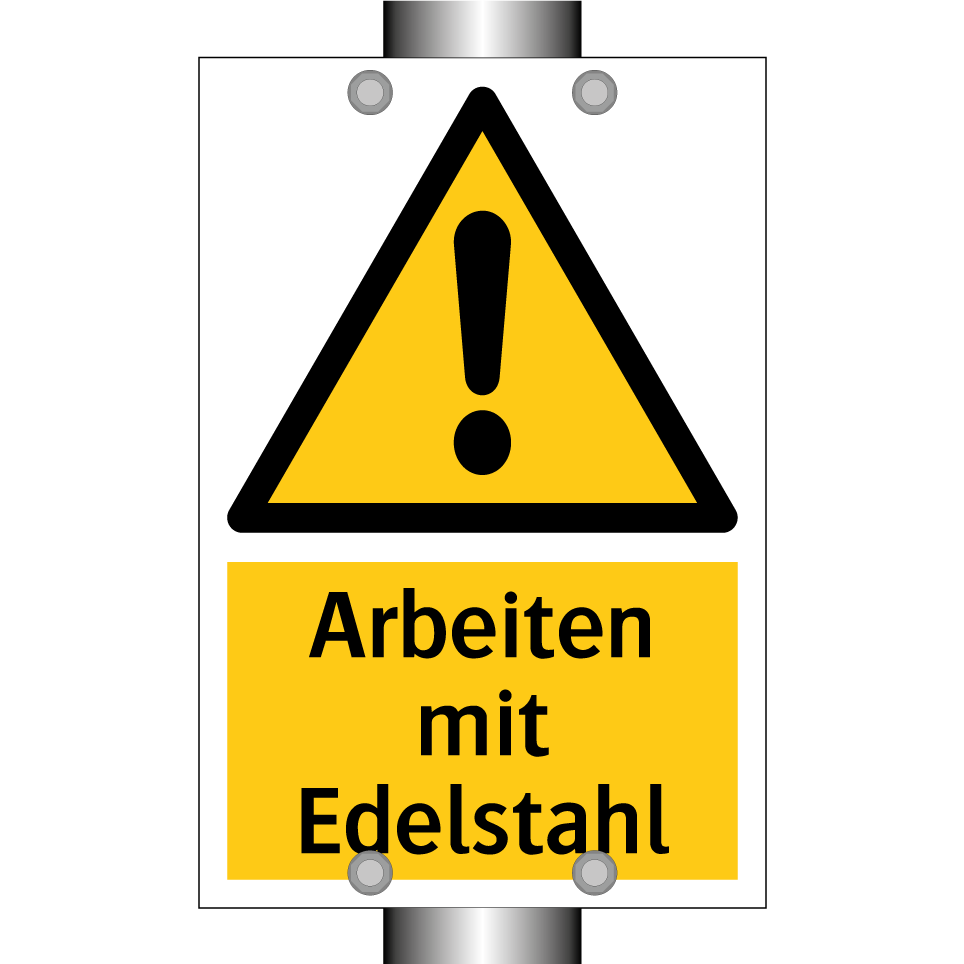 Warnschild mit dem Text Arbeiten mit Edelstahl