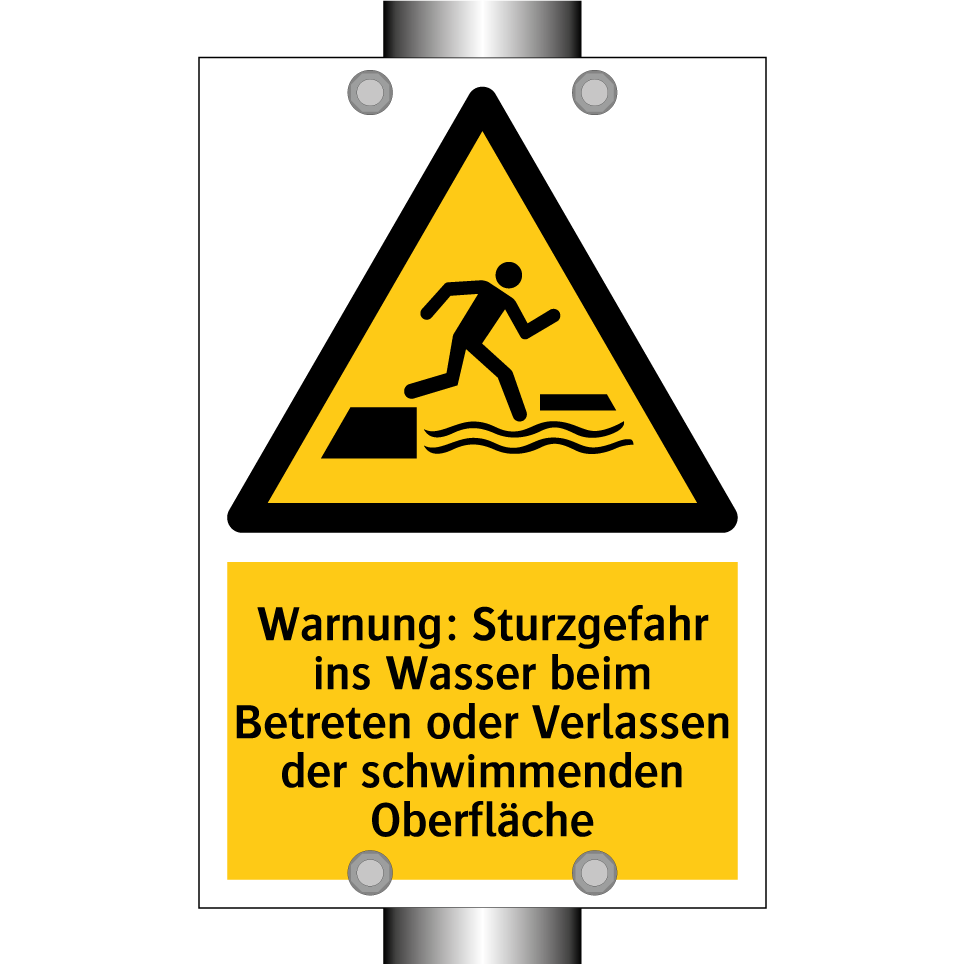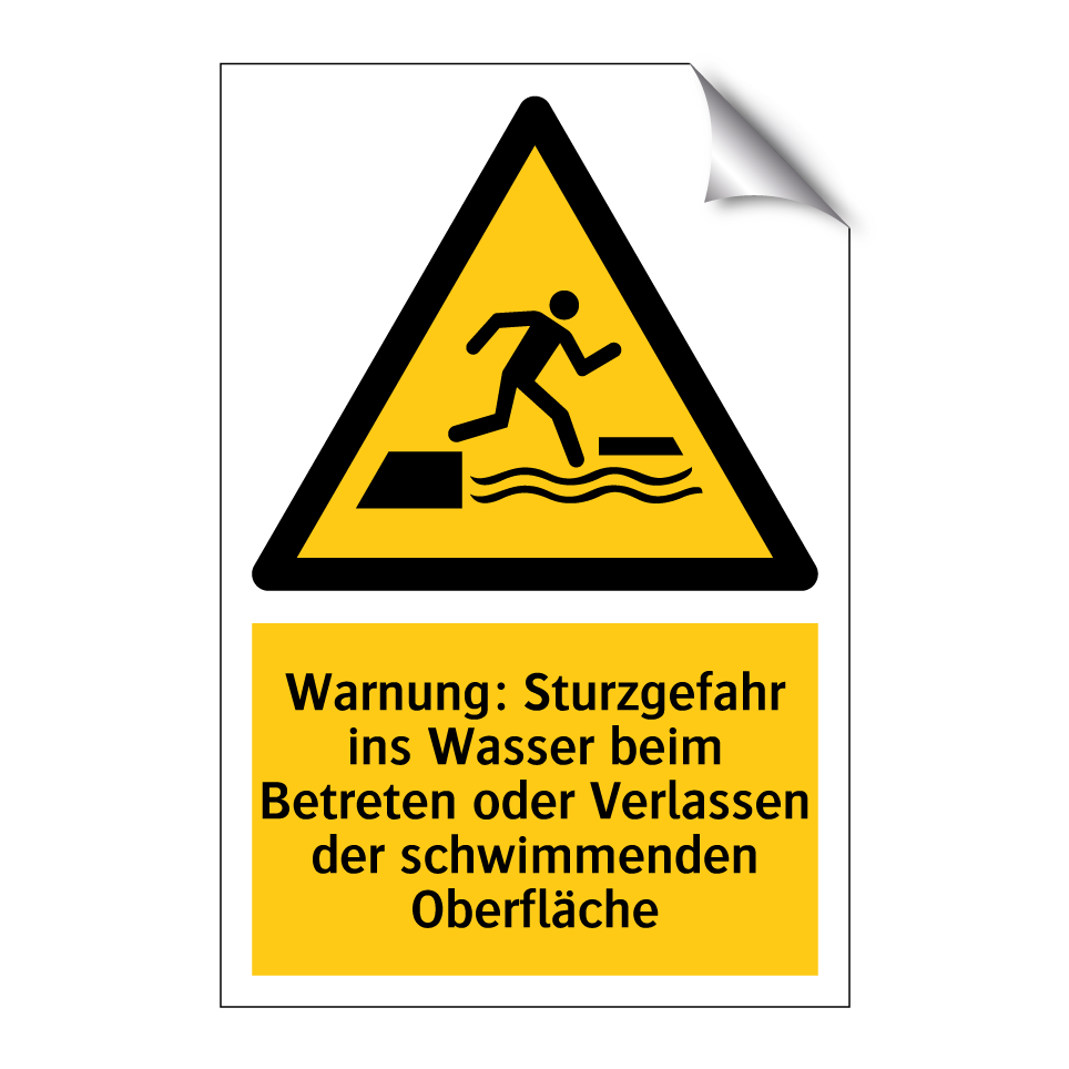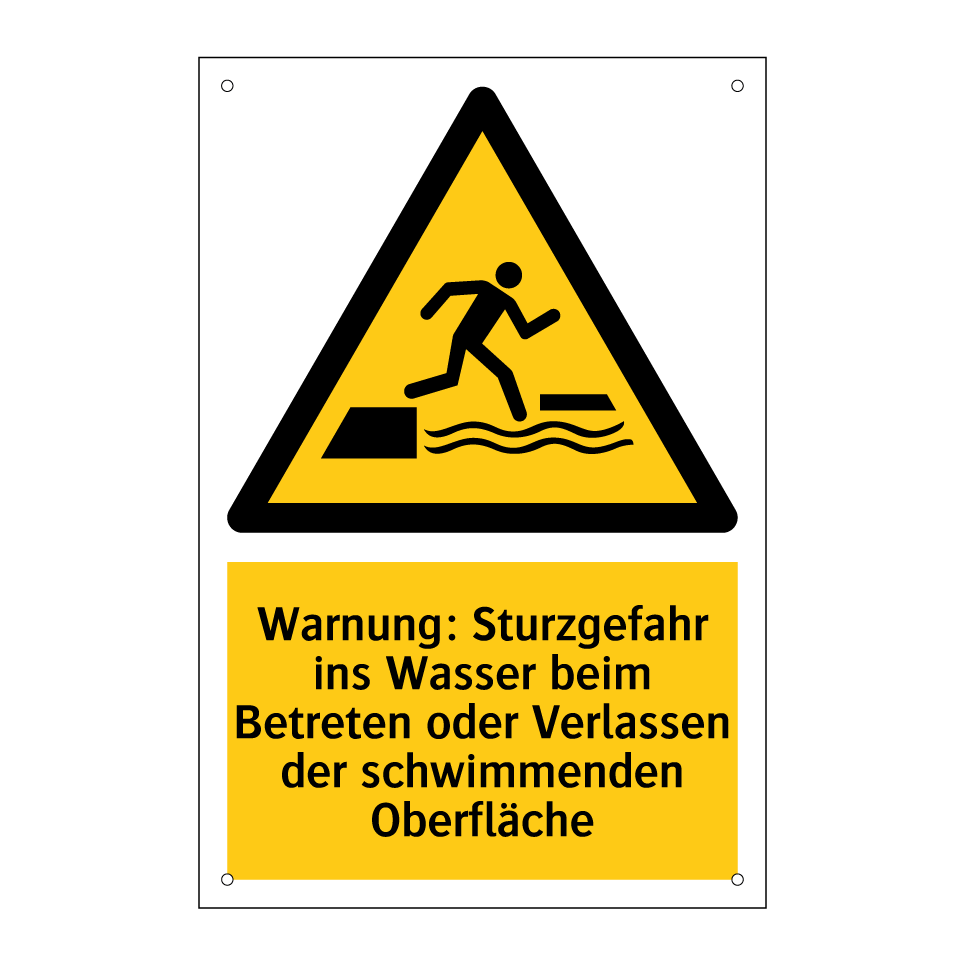 Warnschild mit dem Text Warnung: Sturzgefahr ins Wasser beim Betreten oder Verlassen der schwimmenden Oberfläche
