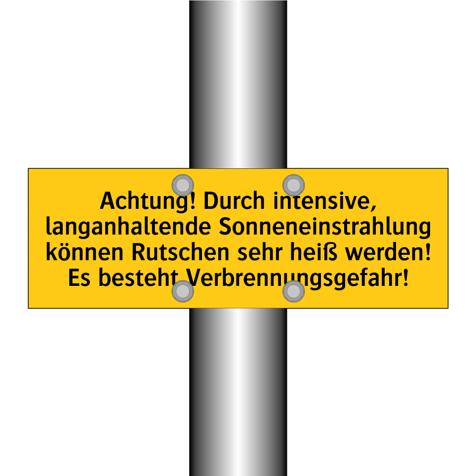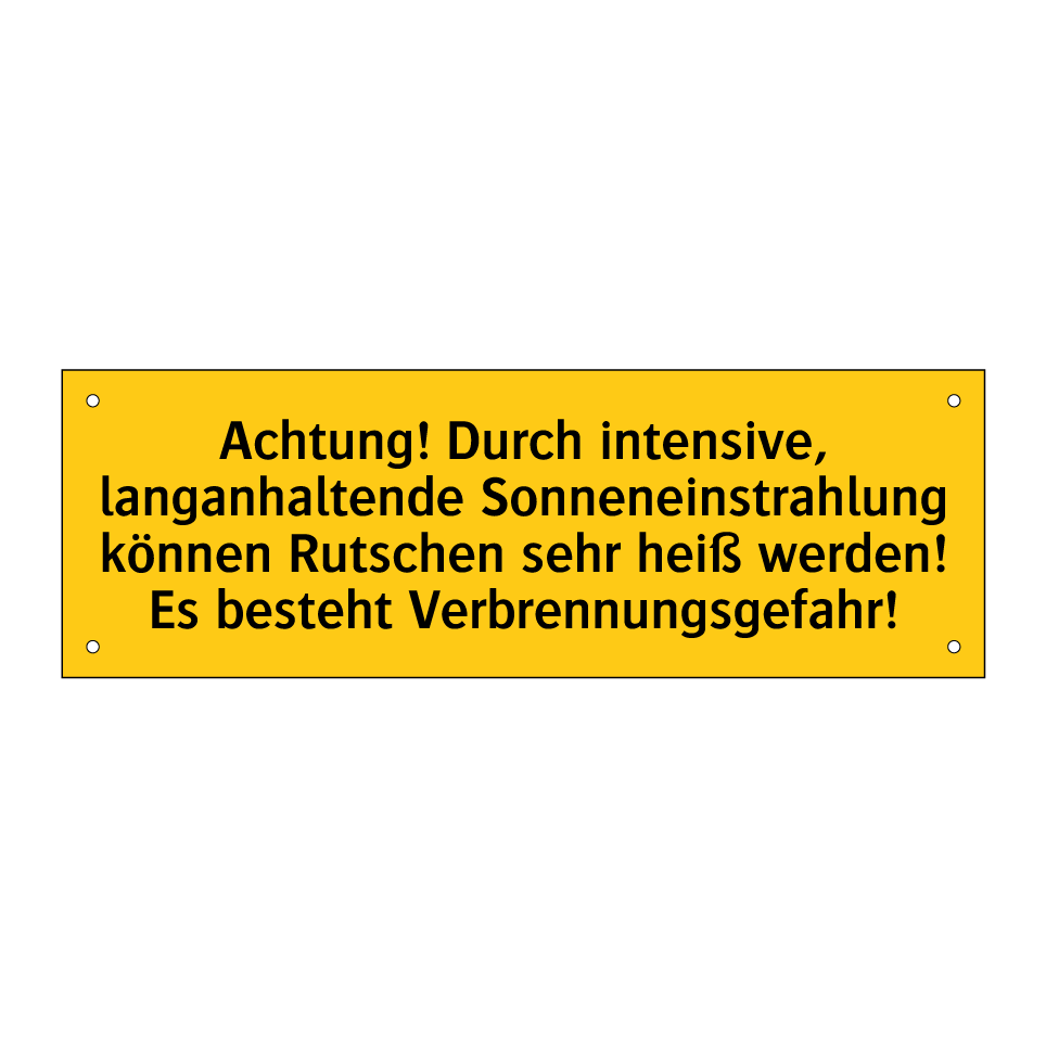 Warnschild mit dem Text Achtung! Durch intensive, langanhaltende Sonneneinstrahlung können Rutschen sehr heiß werden! Es besteht Verbrennungsgefahr!