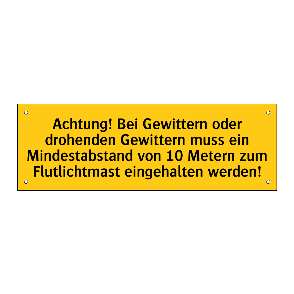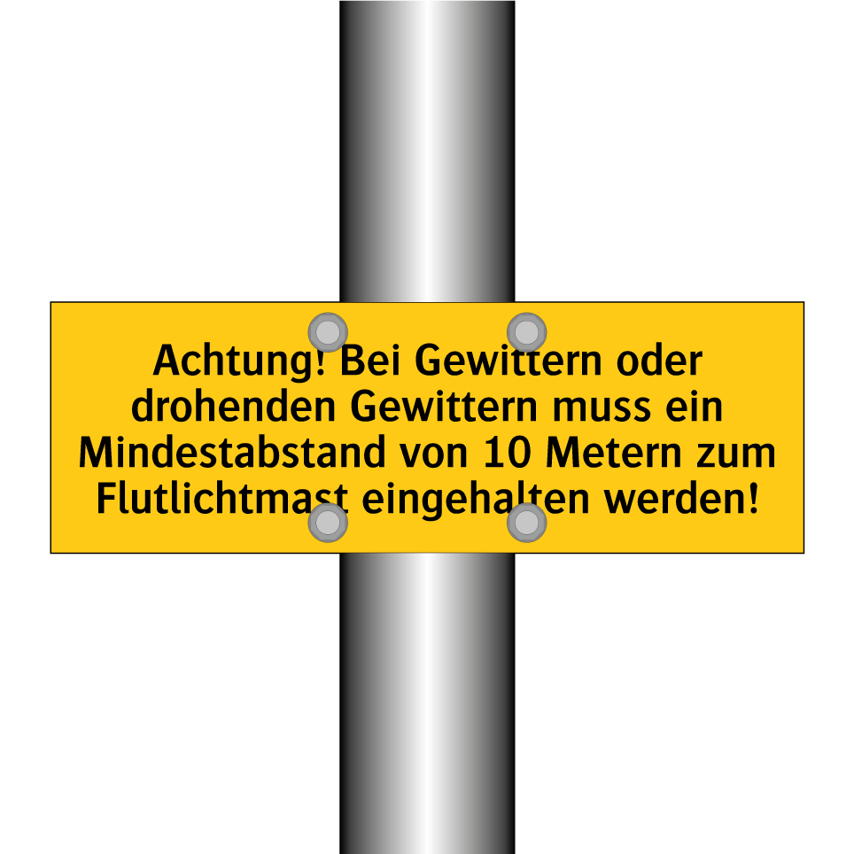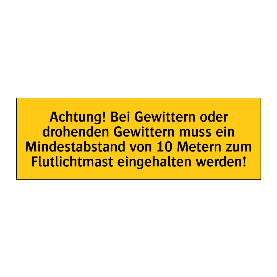 Warnschild mit dem Text Achtung! Bei Gewittern oder drohenden Gewittern muss ein Mindestabstand von 10 Metern zum Flutlichtmast eingehalten werden!