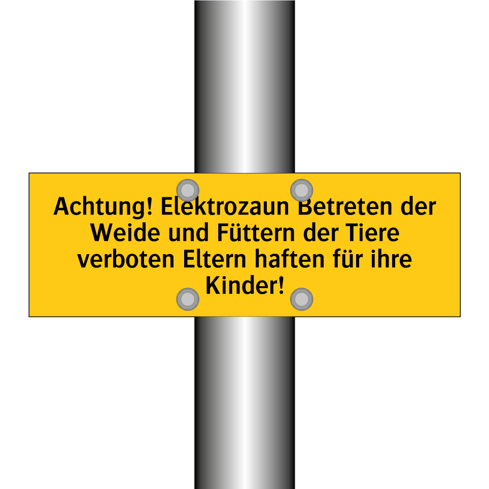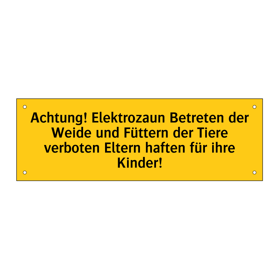 Warnschild mit dem Text Achtung! Elektrozaun Betreten der Weide und Füttern der Tiere verboten Eltern haften für ihre Kinder!