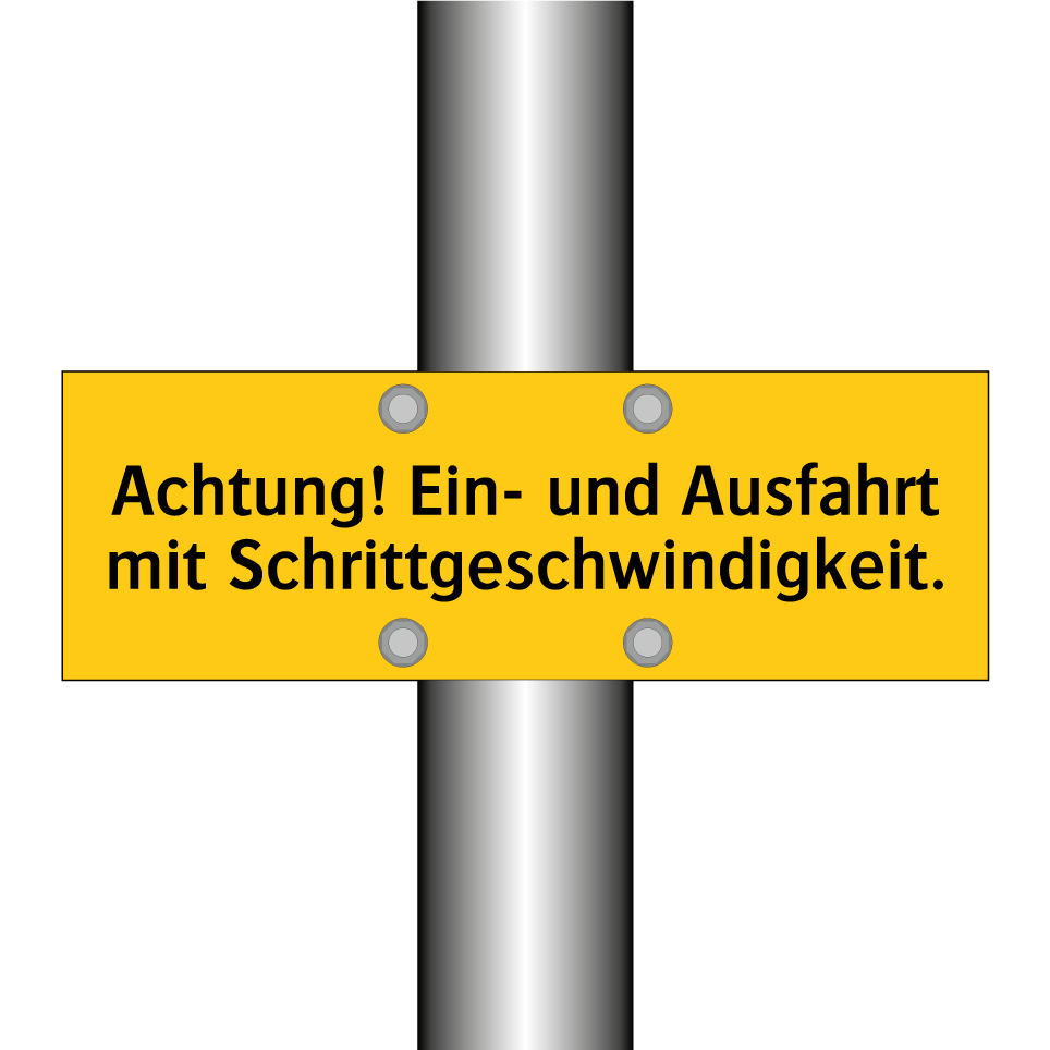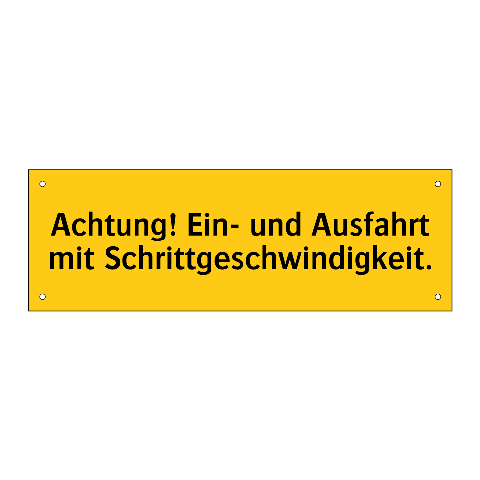 Warnschild mit dem Text Achtung! Ein- und Ausfahrt mit Schrittgeschwindigkeit.