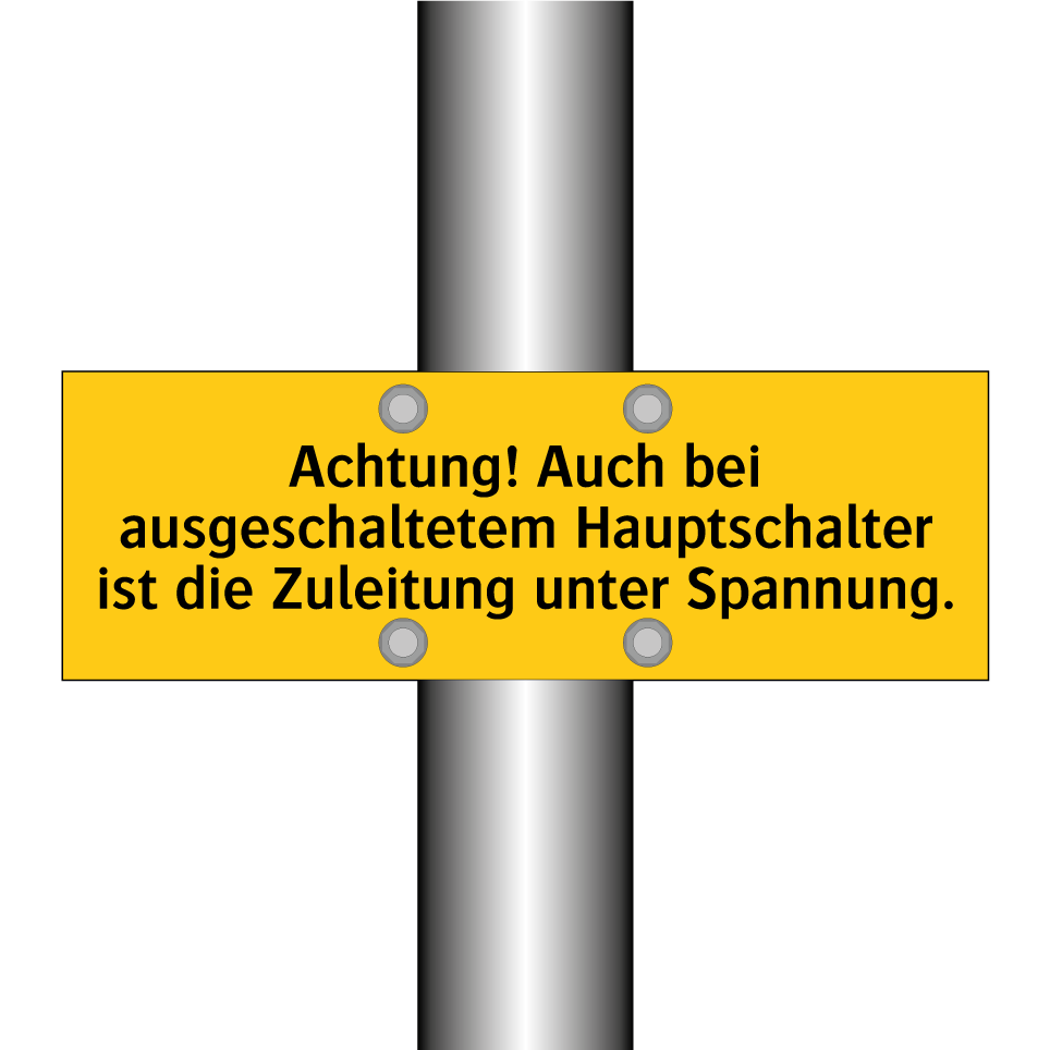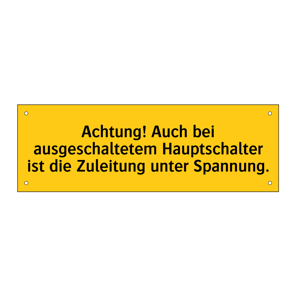 Warnschild mit dem Text Achtung! Auch bei ausgeschaltetem Hauptschalter ist die Zuleitung unter Spannung.