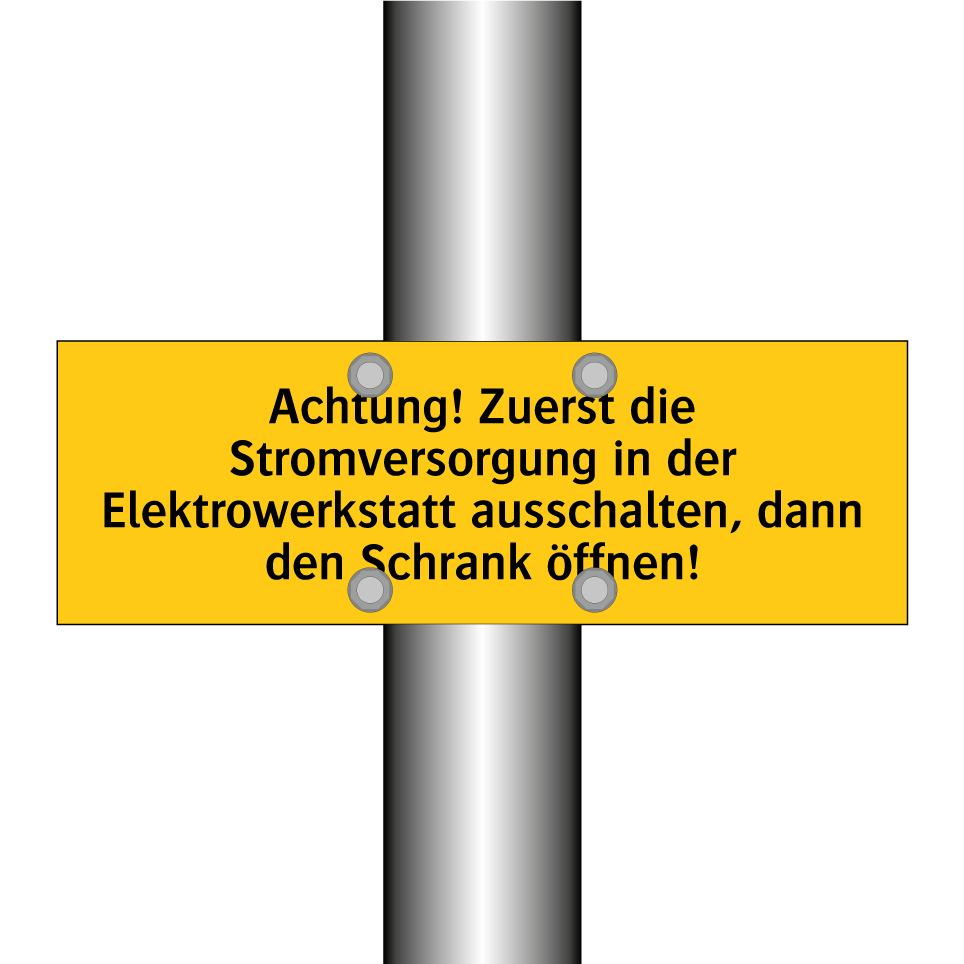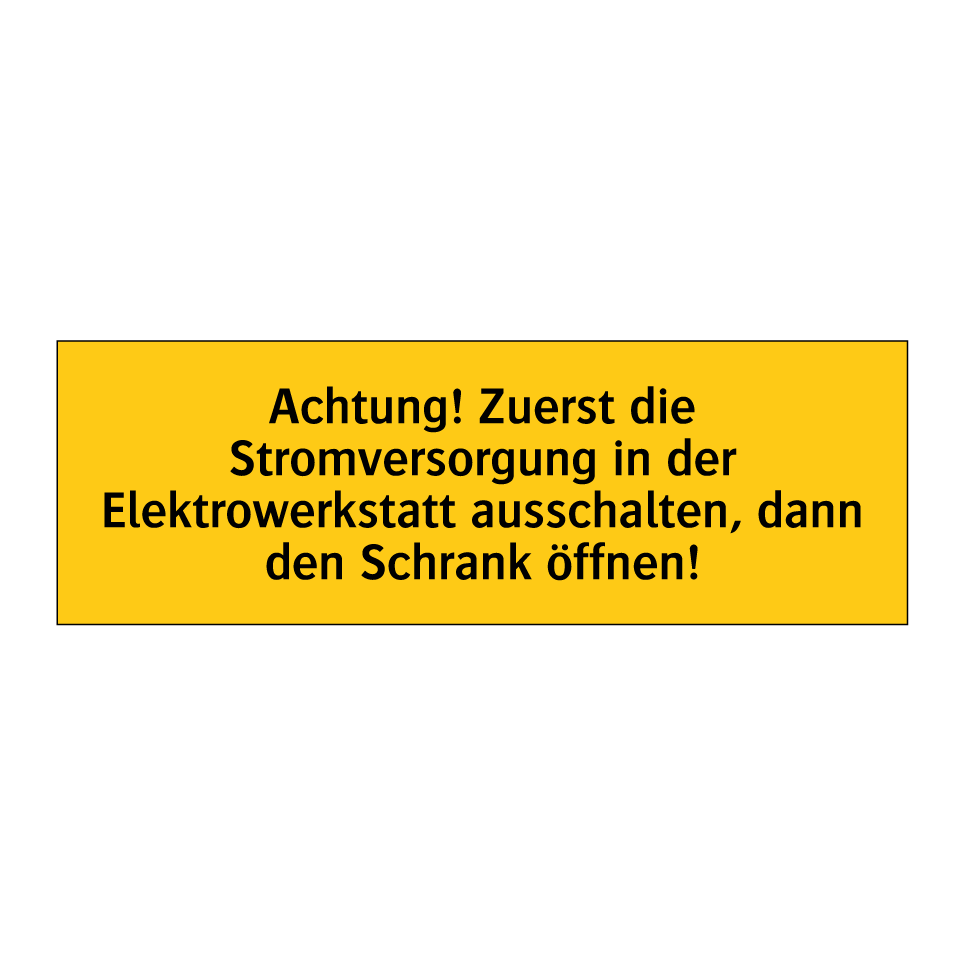 Warnschild mit dem Text Achtung! Zuerst die Stromversorgung in der Elektrowerkstatt ausschalten, dann den Schrank öffnen!