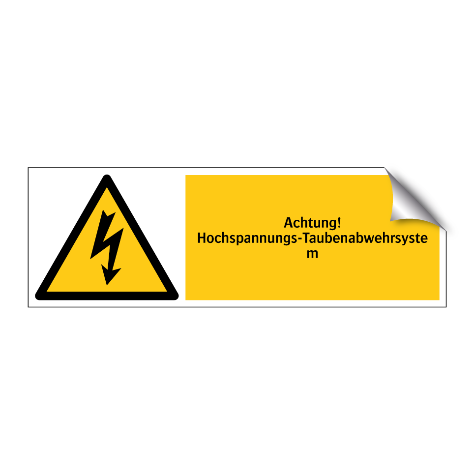 Warnschild mit dem Text Achtung! Hochspannungs-Taubenabwehrsystem
