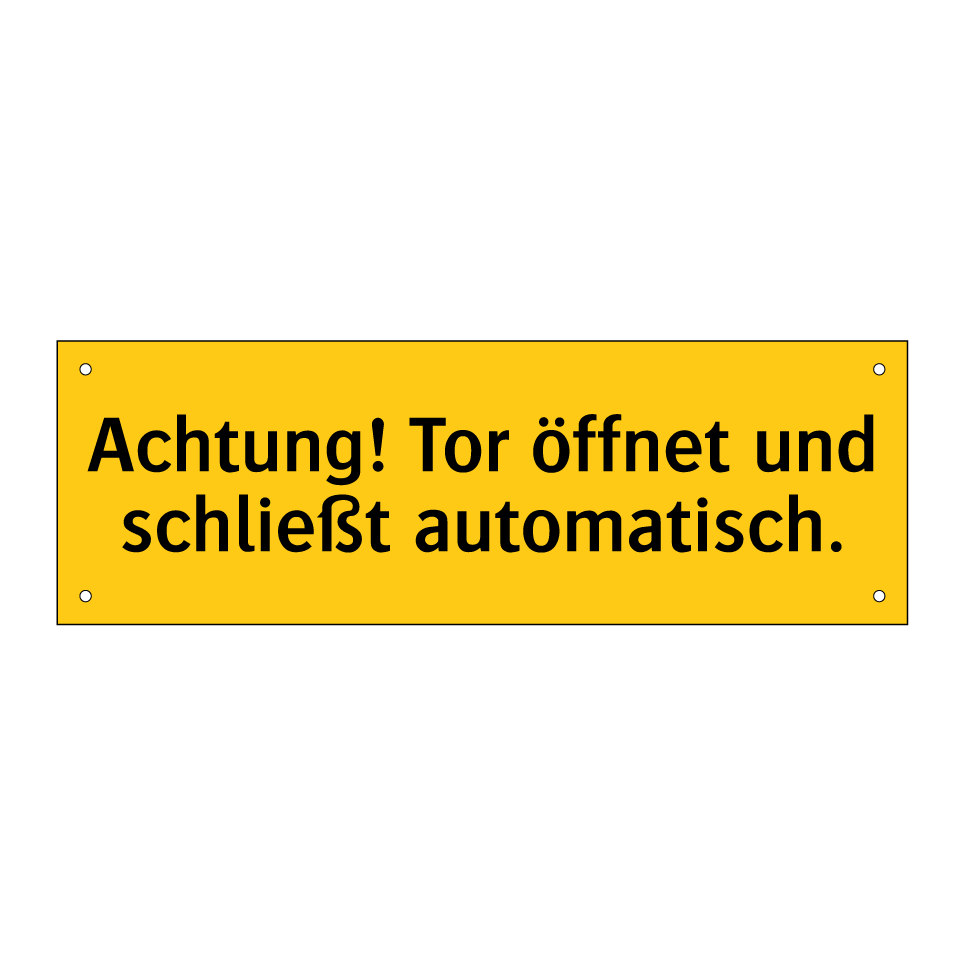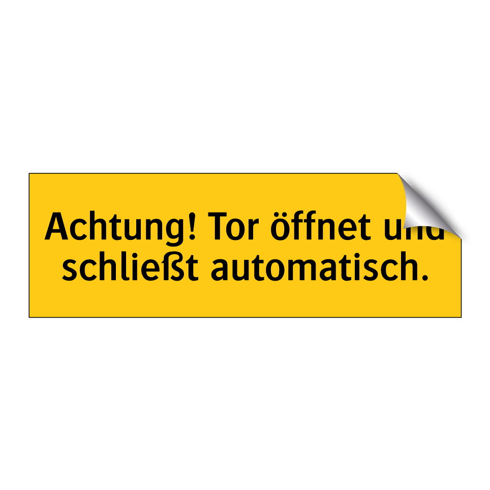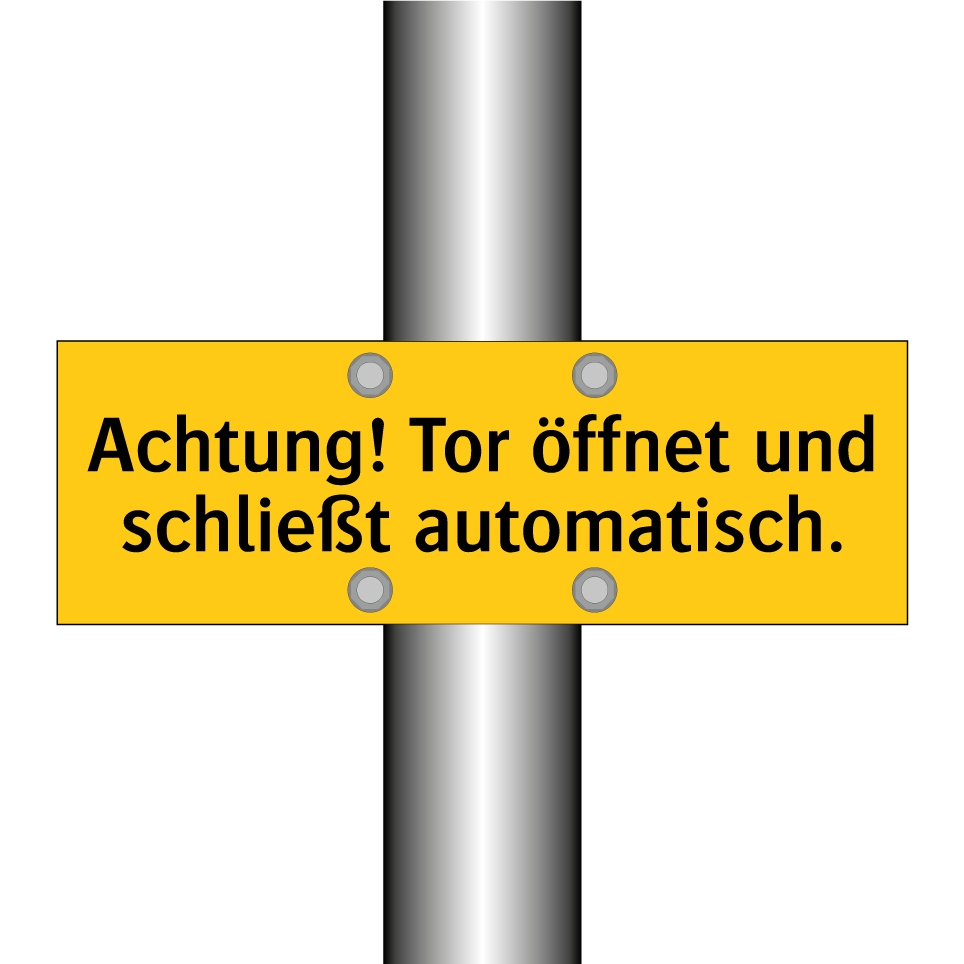 Warnschild mit dem Text Achtung! Tor öffnet und schließt automatisch.