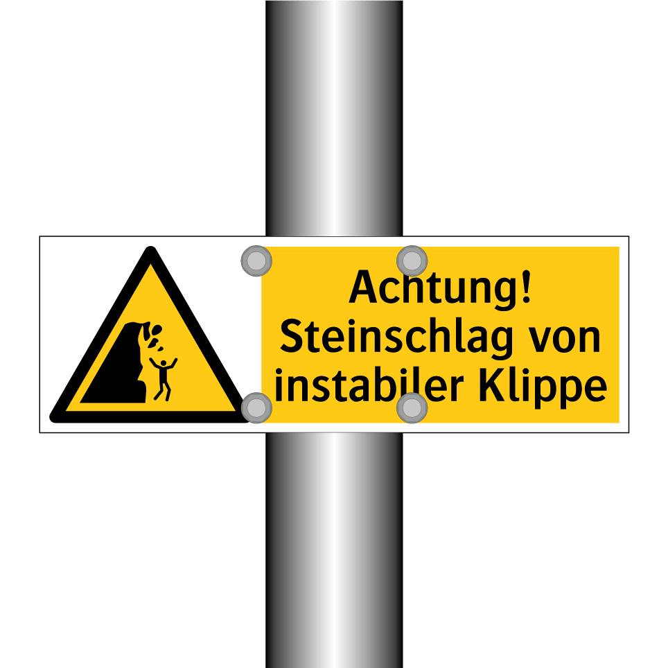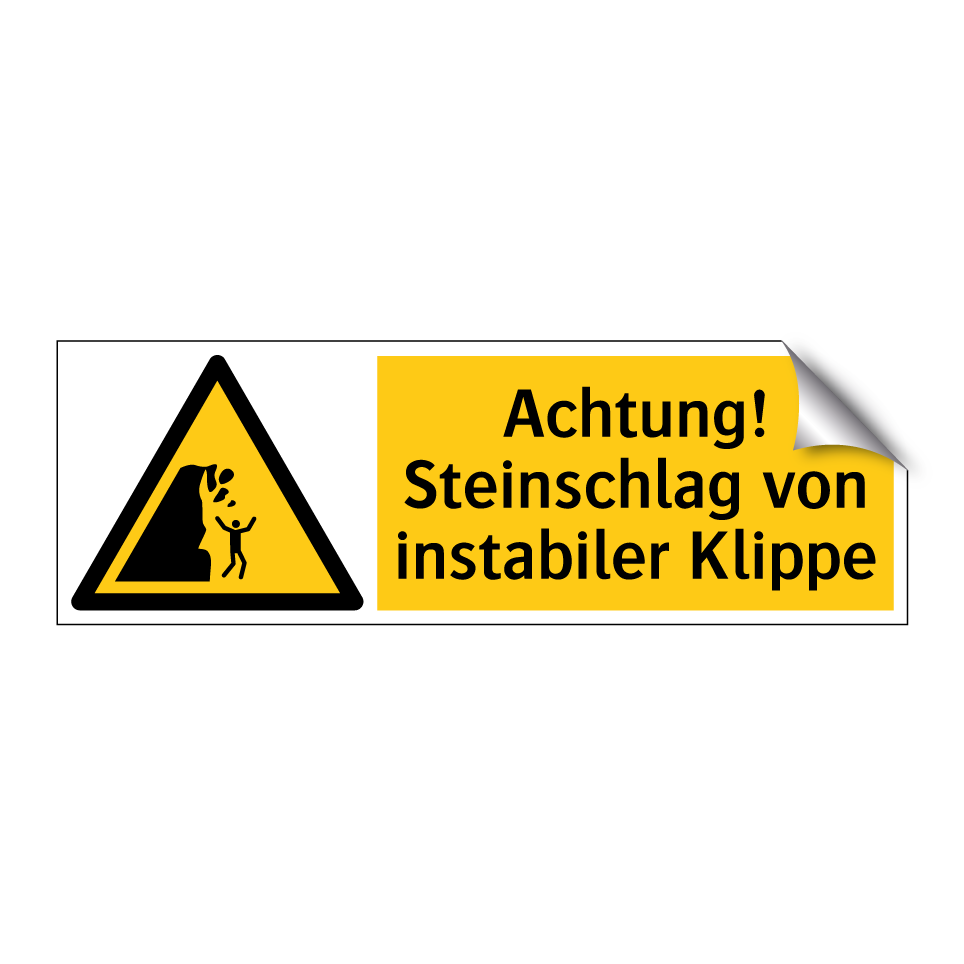 Warnschild mit dem Text Achtung! Steinschlag von instabiler Klippe