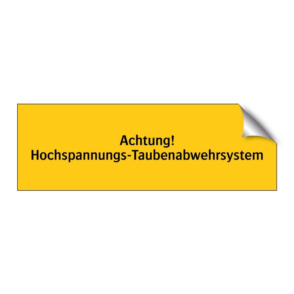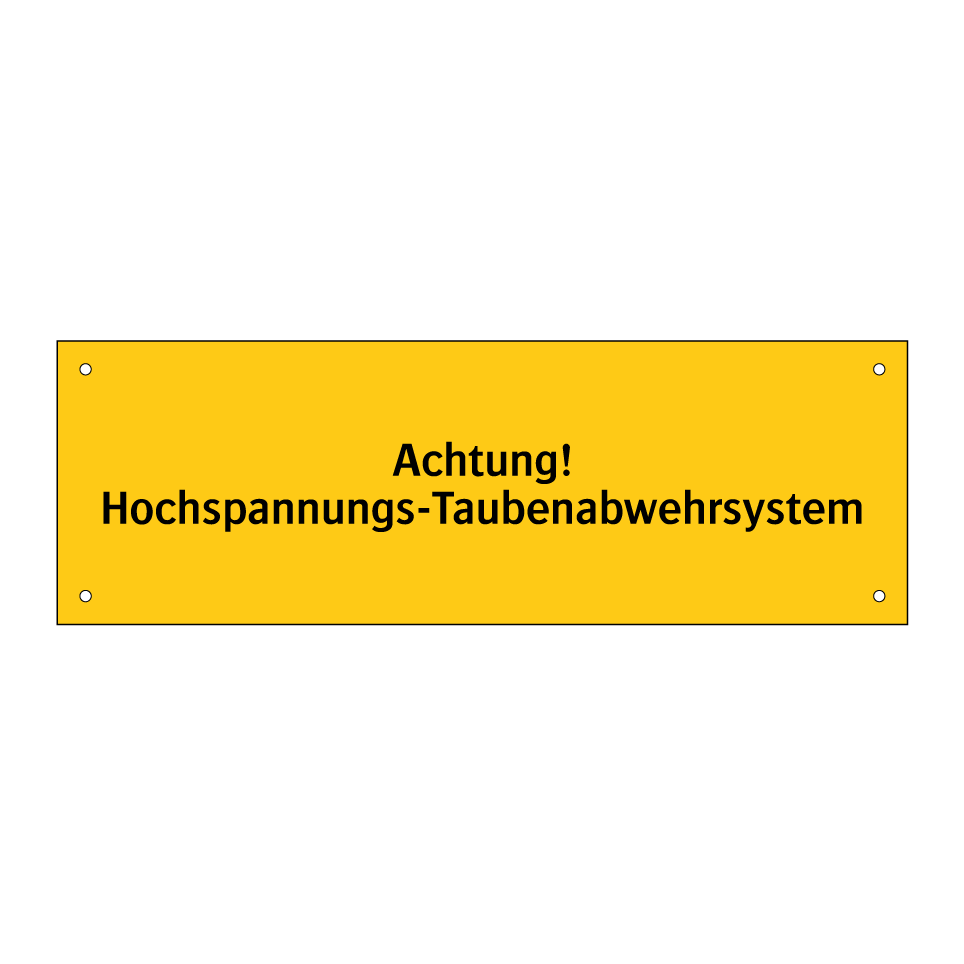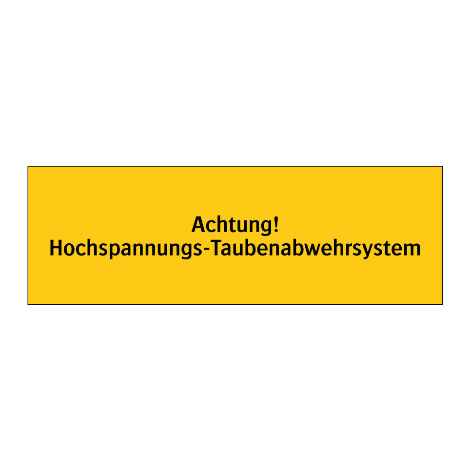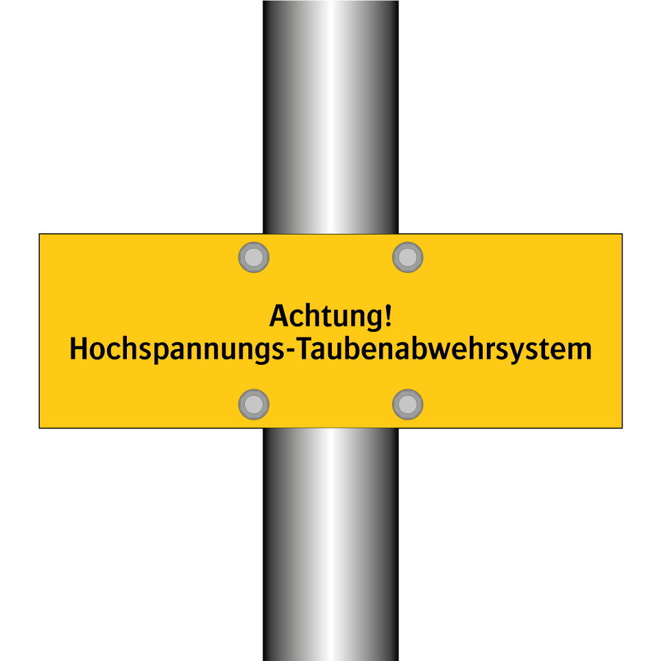 Warnschild mit dem Text Achtung! Hochspannungs-Taubenabwehrsystem