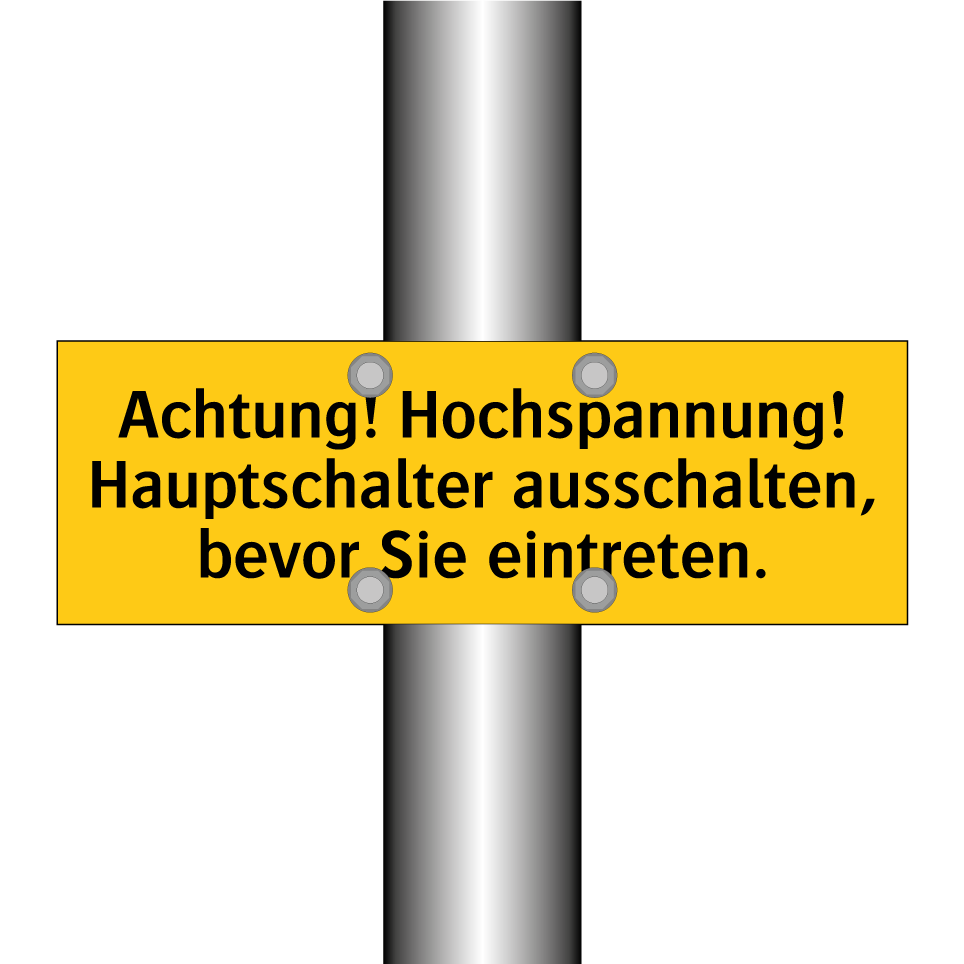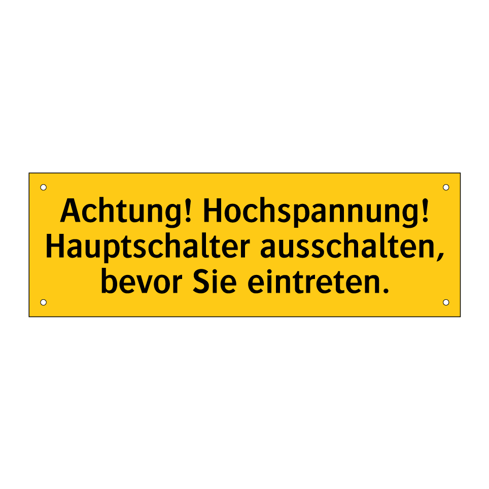 Warnschild mit dem Text Achtung! Hochspannung! Hauptschalter ausschalten, bevor Sie eintreten.