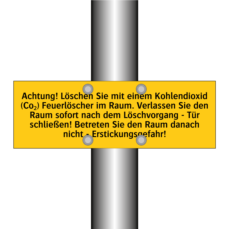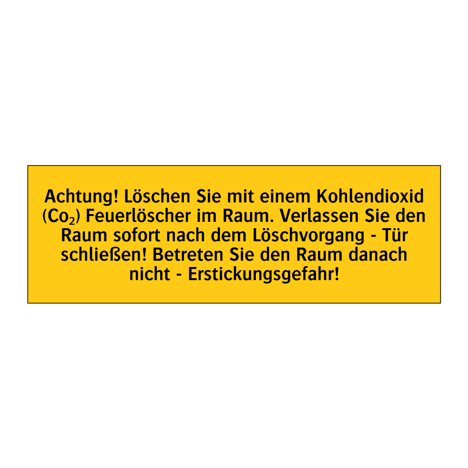 Warnschild mit dem Text Achtung! Löschen Sie mit einem Kohlendioxid (Co₂) Feuerlöscher im Raum. Verlassen Sie den Raum sofort nach dem Löschvorgang - Tür schließen! Betreten Sie den Raum danach nicht - Erstickungsgefahr!