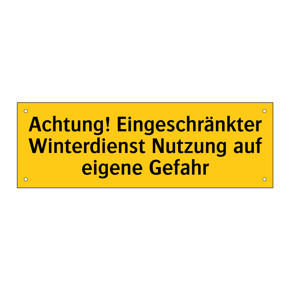 Diese auffällige Warnschild mit gelbem Hintergrund und schwarzer Schrift ist ideal für Bereiche, in denen der Winterdienst eingeschränkt ist. Sie dient dazu, Passanten und Besucher darauf hinzuweisen, dass sie sich auf eigene Gefahr in diesem Gebiet bewegen. Diese Warnschilder sind besonders nützlich in Parkplätzen, Gehwegen oder privaten Zufahrten, wo Schnee und Eis nicht regelmäßig geräumt werden. Durch die klare und prägnante Botschaft wird die Sicherheit erhöht, indem sie das Bewusstsein für mögliche Gefahren schärft. Platzieren Sie das Warnschild an gut sichtbaren Stellen, um maximale Aufmerksamkeit zu gewährleisten und Unfälle zu vermeiden.