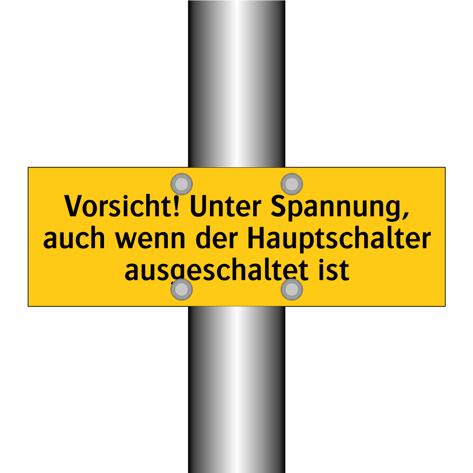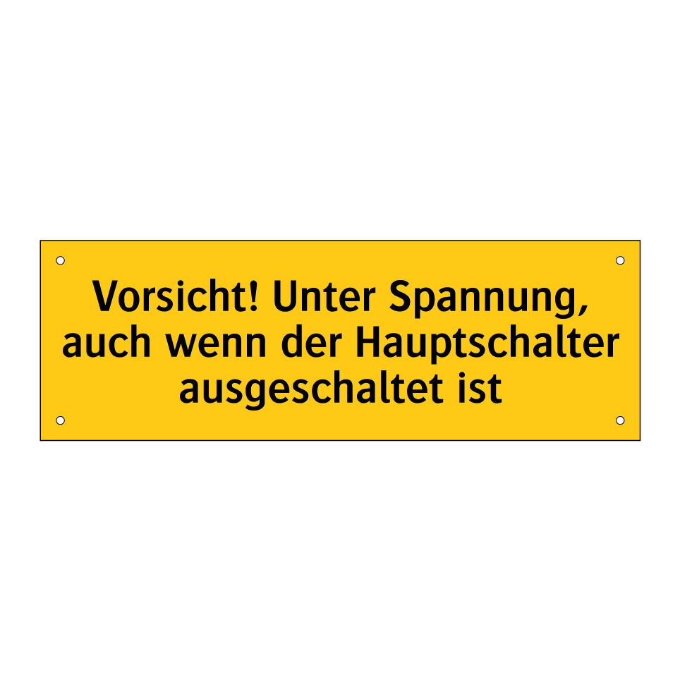 Warnschild mit dem Text Vorsicht! Unter Spannung, auch wenn der Hauptschalter ausgeschaltet ist