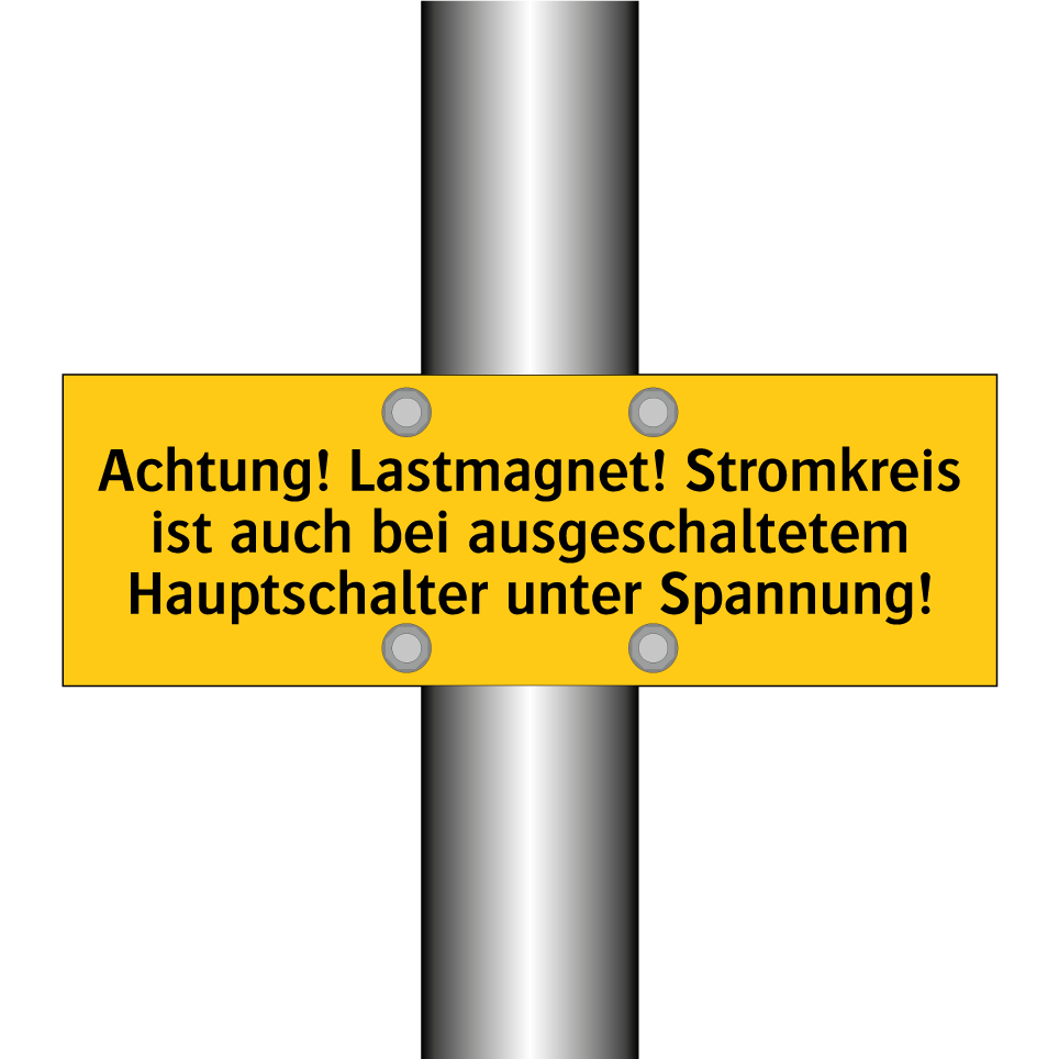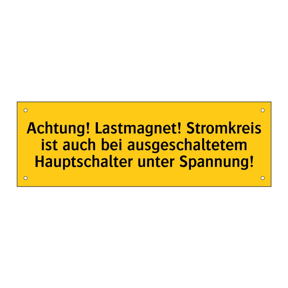 Warnschild mit dem Text Achtung! Lastmagnet! Stromkreis ist auch bei ausgeschaltetem Hauptschalter unter Spannung!