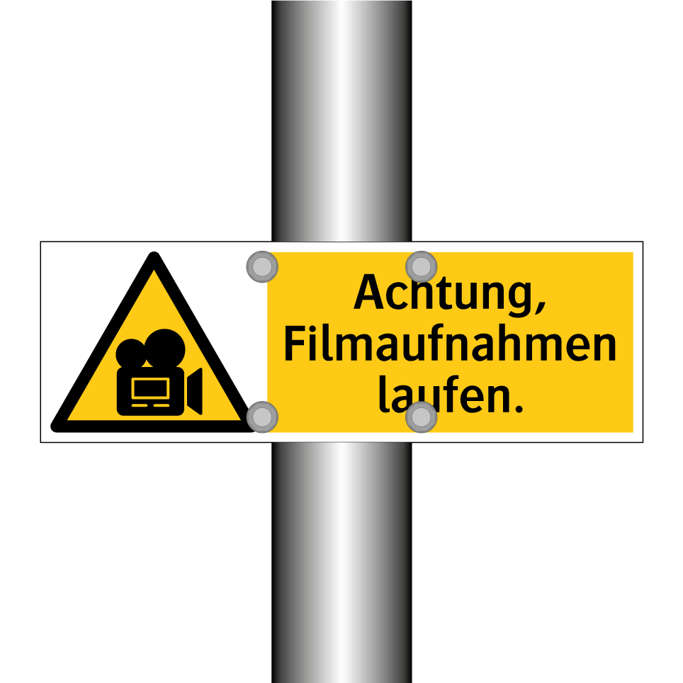 Warnschild mit dem Text Achtung, Filmaufnahmen laufen.