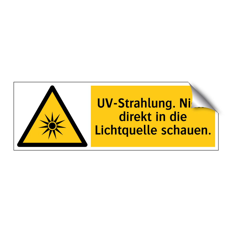 Warnschild mit dem Text UV-Strahlung. Nicht direkt in die Lichtquelle schauen.