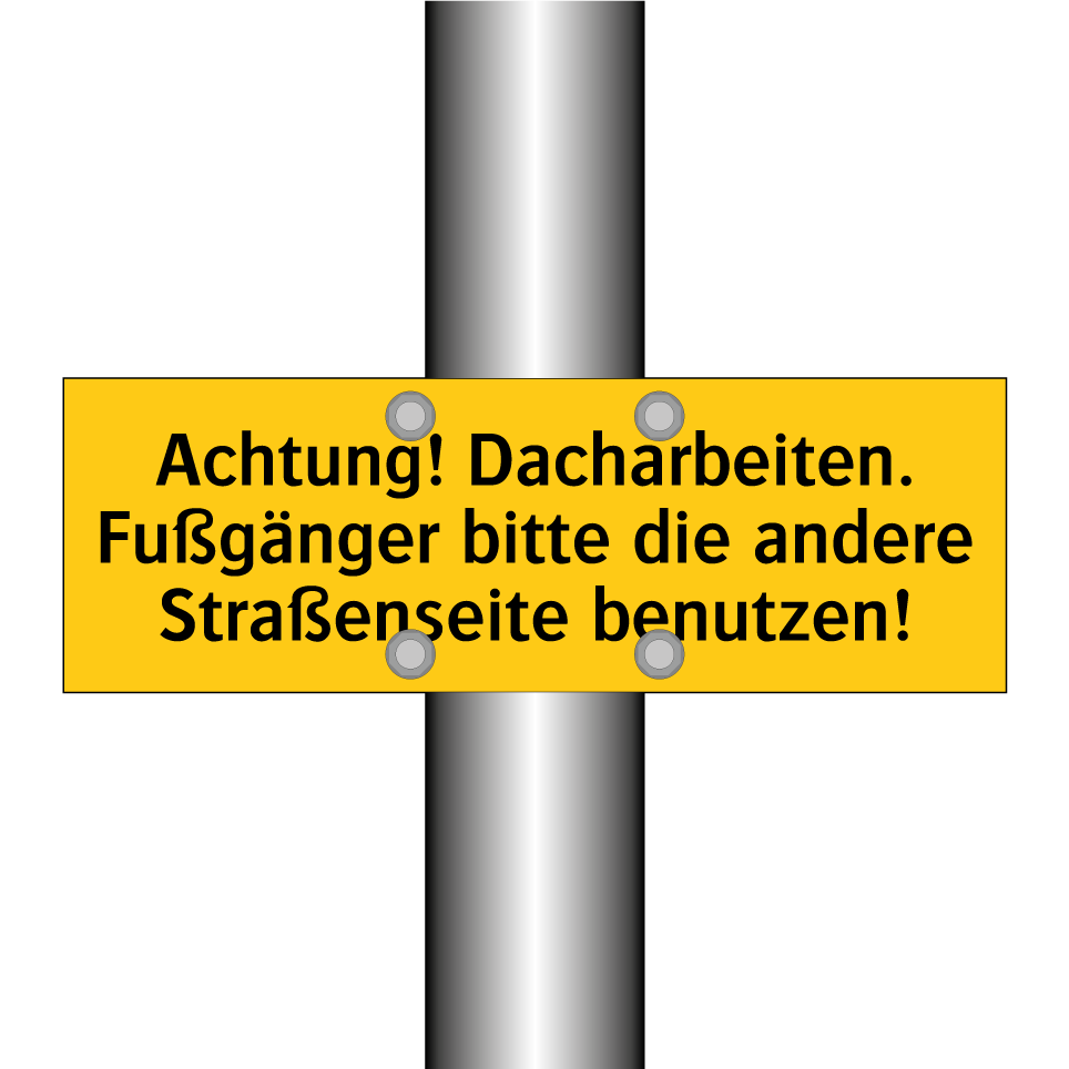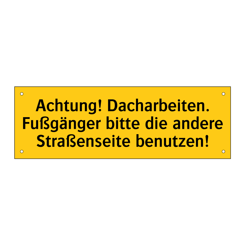 Warnschild mit dem Text Achtung! Dacharbeiten. Fußgänger bitte die andere Straßenseite benutzen!