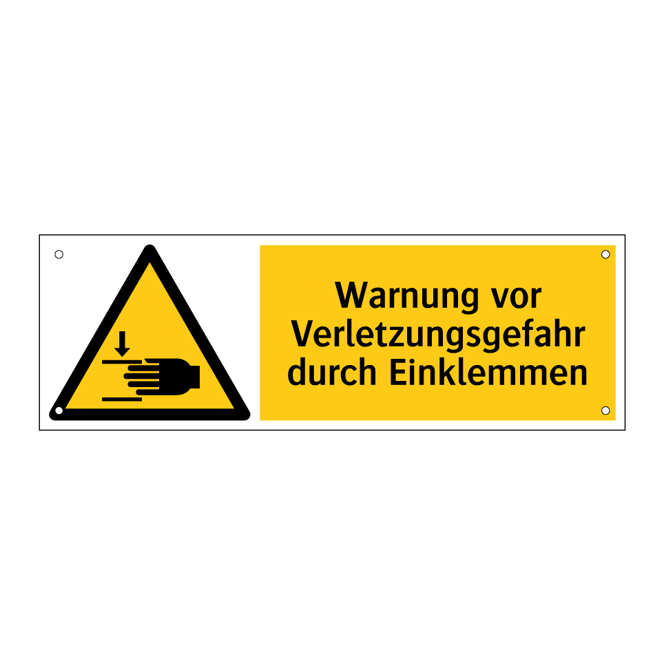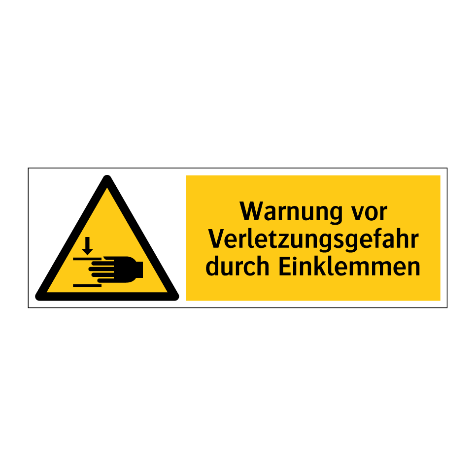 Warnschild mit dem Text Warnung vor Verletzungsgefahr durch Einklemmen