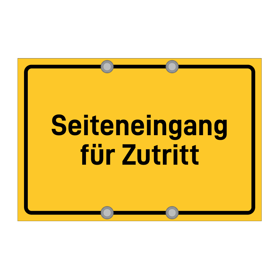 Hinweisschild mit dem Text Seiteneingang für Zutritt
