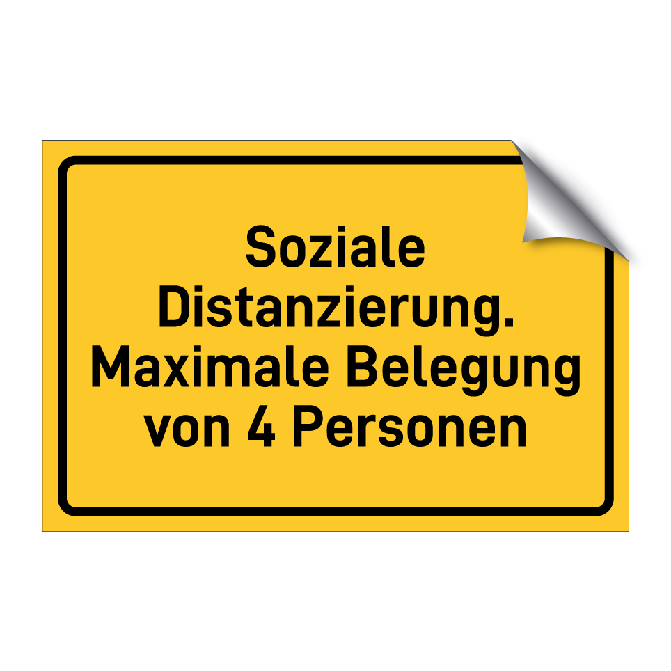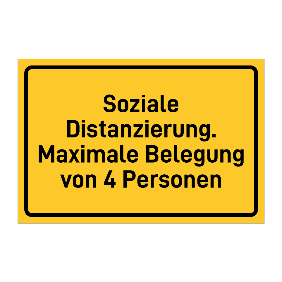 Hinweisschild mit dem Text Soziale Distanzierung. Maximale Belegung von 4 Personen