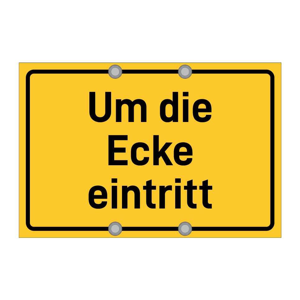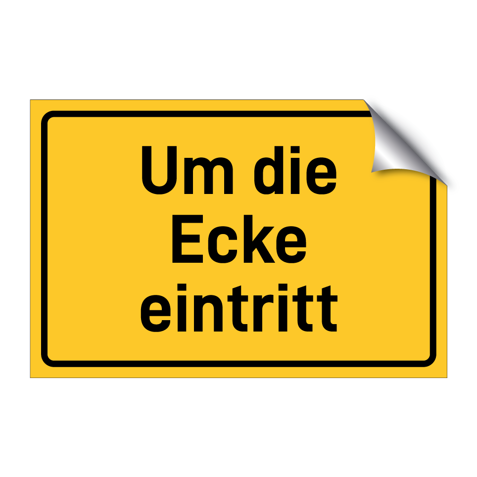 Hinweisschild mit dem Text Um die Ecke eintritt