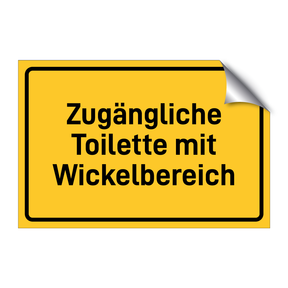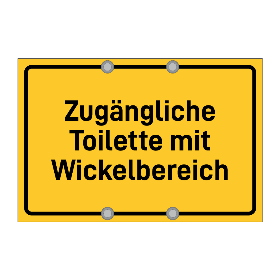 Hinweisschild mit dem Text Zugängliche Toilette mit Wickelbereich